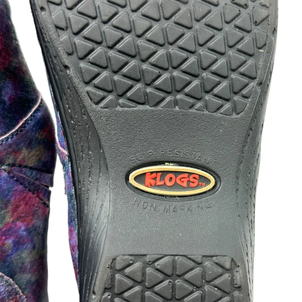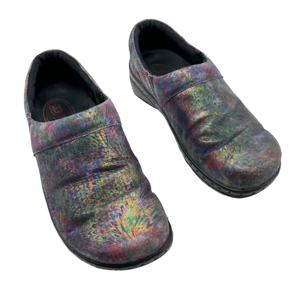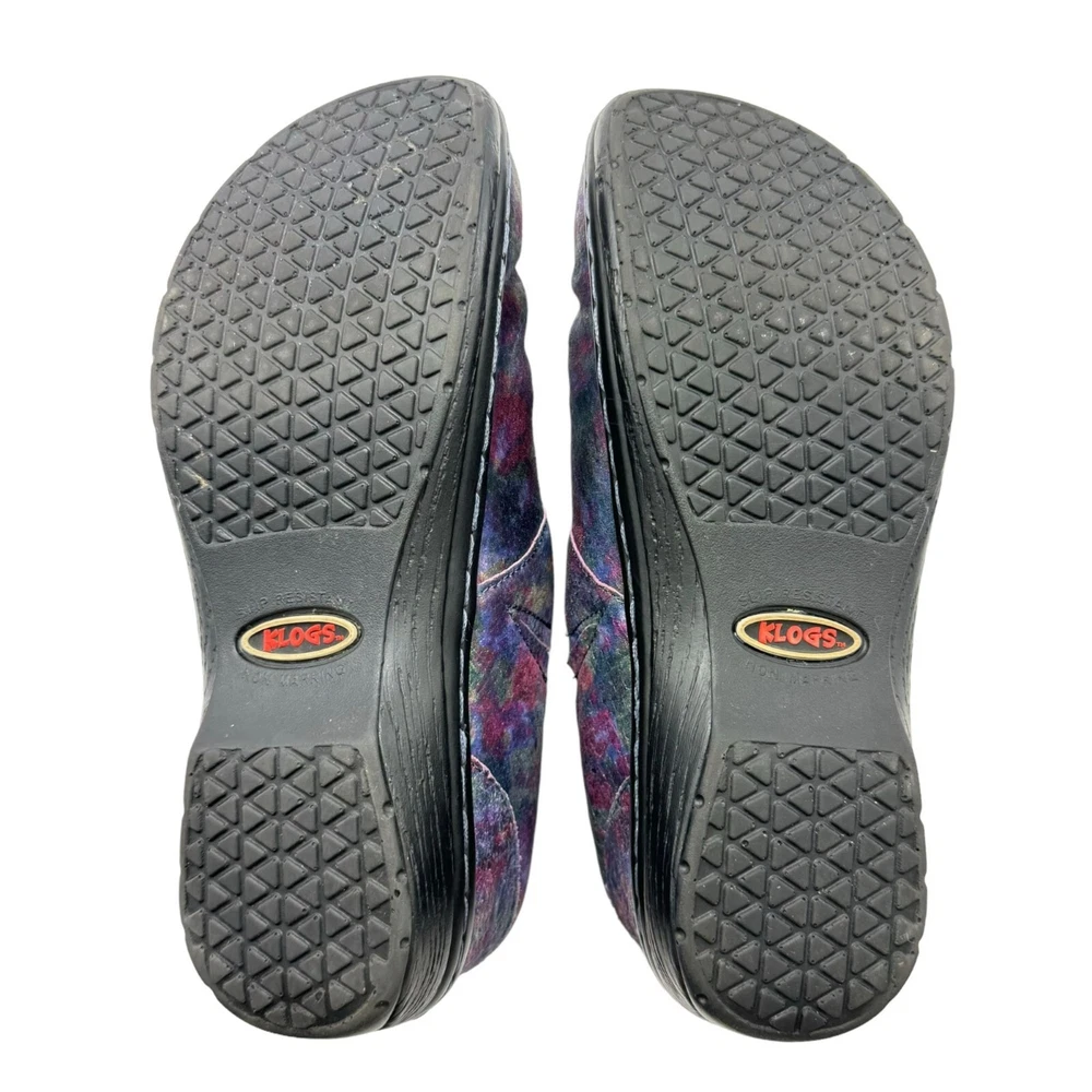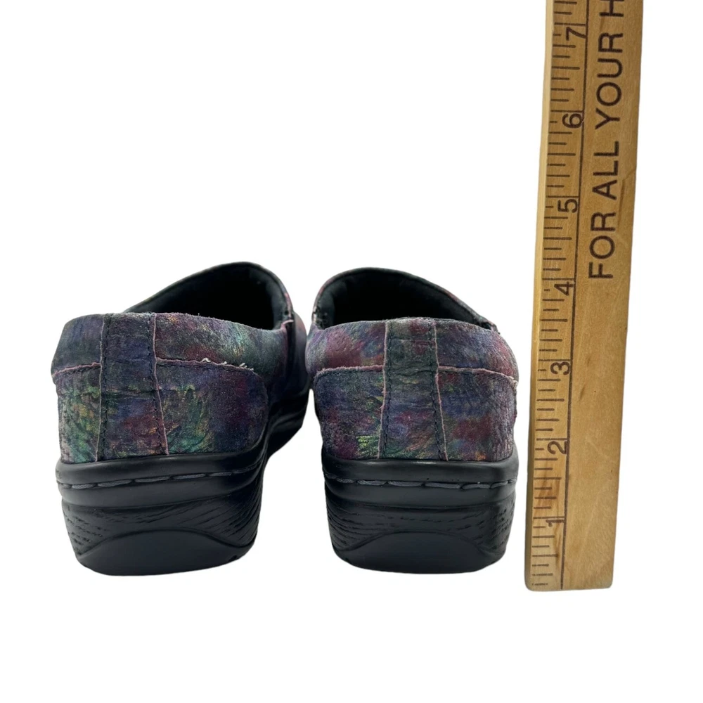Klogs Mission Pyramid Women's Leather Work Clogs - Women's size 7.5M - Rainbow multi color in a shiny iridescent foil finish - Padded collar - Flexible strobel construction - Shock absorbent midsole - Elastic gore - Removable footbed - Polyurethane Outsole - MARK II ASTM F1677 tested slip-resistant outsole - Non-marking outsole - Anti-microbial microfiber lining - Printed leather upper - Accommodates orthotics - Generous toe box - Impact absorbing arch support and heel cup - 1" low wedge heel Size: Womens 7.5 Condition: Pre-Owned Shoes are in very good preowned condition with no flaws.