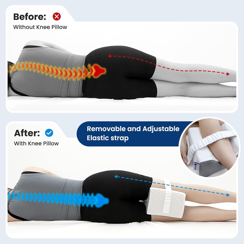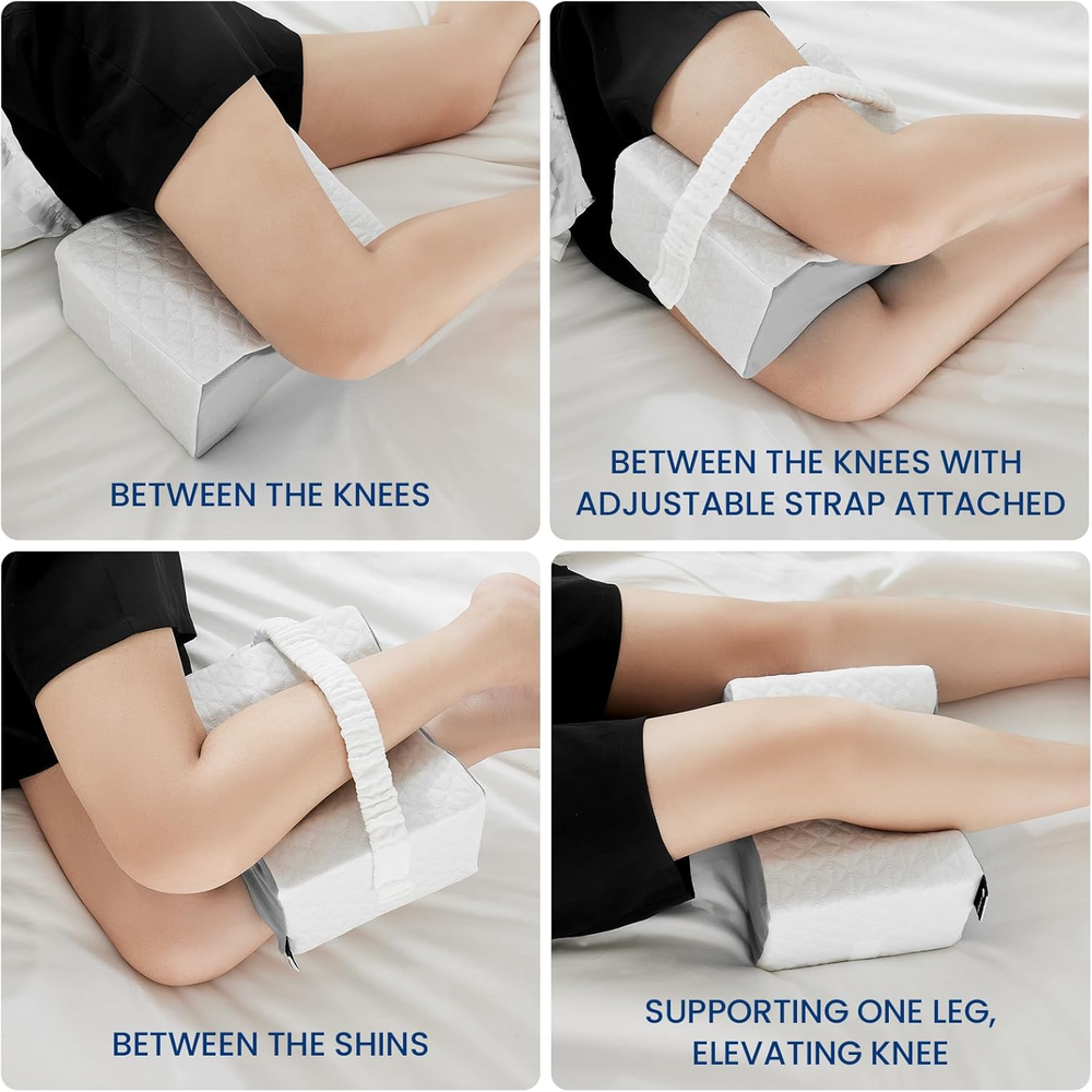 【CERTIPUR-US】Knee pillow for side sleepers is made up of CertiPUR-US certified memory foam,simple and powerful demonstration of the safety of products and effective defense of consumer interests. 【COOLING & BREATHABLE】White part of the cooling knee pillow cover in contact with the head is made of 100% PE microfiber cooling material,which provides incredible and long-lasting coolness,and the gray part of the side is made of breathable fiber material,which avoids sweltering during sleep and provides a better quality of sleep. 【ERGONOMIC DESIGN】Leg pillow size is 10'' X 8' X 6''in, ergonomic leg pillow for side sleeping is based on extensive research in ergonomic to design the perfect size knee pillow for most body types.The knee pillow conforms perfectly to your body,aligning your cervical spine and vertebrae.This ergonomically designed knee pillow supports your legs at the proper spacing to keep your legs,hips and spine properly aligned during sleep,which improves blood circulation,improves poor sleeping posture,relieves back pain,sciatica,and swollen feet,and provides strong protection and support during pregnancy,post-surgery recovery,injury recovery,and daily work reading. 【ADJUSTABLE & REMOVABLE STRAPS】Knee pillow for side sleeper is designed with adjustable and removable straps.The straps are bonded on both sides with high quality velcro and can be removed at any time if you don't need the straps.If you feel that the straps are fixed too tight or too loose,you can make adjustments through both sides.In addition,our straps themselves have good elasticity,which can make you better fixed during use.Allows you to sleep without having to repeatedly adjust your position and provides continuous support for your legs. 【UNIQUE DETAILS】Wedge pillow for back pain relief has a removable cover that is easy to remove and makes cleaning easier.In addition,our knee pillows feature hidden zippers,which prevent the zipper from accidentally piercing the skin during use,making them even safer. Product description SOFT SURFACE Soft and Silky Texture,breathable fiber material WASHABLE Easy to clean, the outer protective case is detachable and machine washable without damaging the surface DIAMOND PATTERN DESIGN The diamond pattern design is beautiful and comfortable REMOVEABLE COVER Zipper disassembly Easy to change and clean. Hidden zipper design , non-sensitive , safer and more comfortable