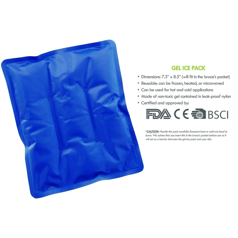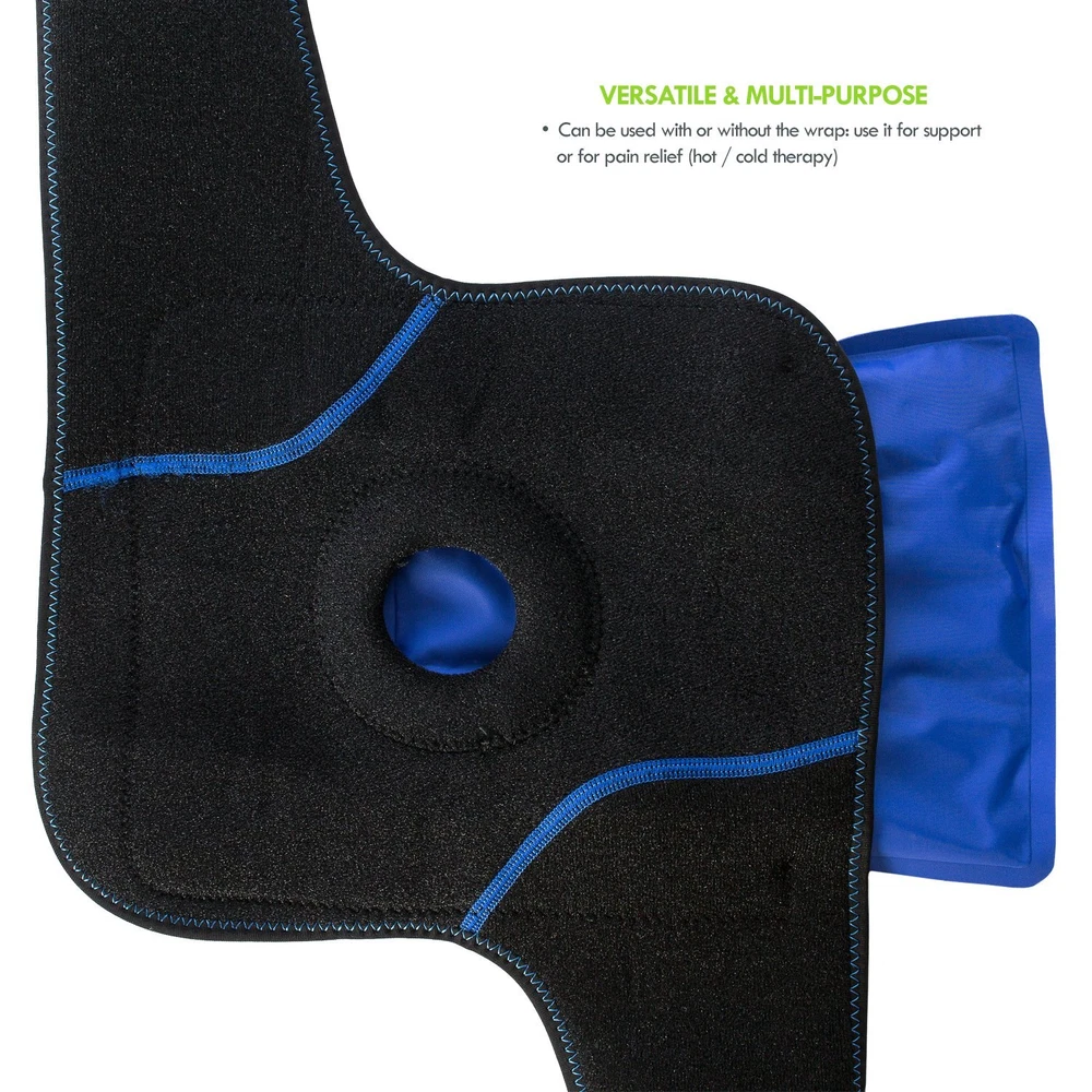 Knee & Elbow Wrap with Gel Ice Pack by An effective all-around solution for your knees and elbows: comfort, circulation, compression, mobility, support and pain relief! FEATURES ✓ Help support full natural movement, circulation and compression on your knee or elbow. ✓ Designed as an adjustable one-size-fits-all wrap that has opposite straps with strong fastener closures to help secure and tighten it in place comfortably. ✓ Front circular opening promotes proper motion and help reduce pressure on the patella / joint. ✓ Includes an inside pocket to insert the included flexible gel ice pack — perfect for hot or cold therapy on your limbs! ✓ Useful for pain relief and recovery from meniscus tear, ACL, tendonitis, tennis elbow, arthritis, runner's knee, swelling, surgery, muscle strain, and more. CONTENTS - 1 piece of adjustable latex-free wrap made of stretchable neoprene (65%), nylon (20%) and polyester (15%) that is 32.5" long and 10.5" wide - 1 non-toxic reusable gel ice pack contained in leak-proof nylon (7.3" x 8.5") which can be used for both hot and cold therapy. ADDITIONAL NOTES - To clean the wrap, handwash it gently in cold water with mild detergent and dry it flat. Do NOT iron. - For gel ice pack, limit application to only 20min at a time and repeat every 2 hours as needed. - Gel will become too hard in sub-zero freezers; let it thaw a bit before use. OUR GUARANTEE ✓ PREMIUM products, SECURE checkout and OUTSTANDING customer service. Please get in touch with us for any inquiries or concerns. ✓ 1-Year Warranty (FREE No-Hassle Replacement!) Gain the best support for your knee& elbow — buy this wrap NOW before our SALE expires! 2-IN-1 FEATURE KNEE & ELBOW WRAP WITH HOT & COLD THERAPY GEL ICE PACK: A one-size-fits-all wrap for your knee or elbow that will help promote full natural movement, circulation, compression, and recovery. Plus, with the inclusion of a non-toxic reusable gel ice pack (7. 3" x 8. 5") which you can insert in the wrap's inner pocket, the wrap will transform into an effective hot or cold pack that's suitable for pain relief.