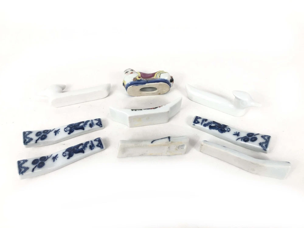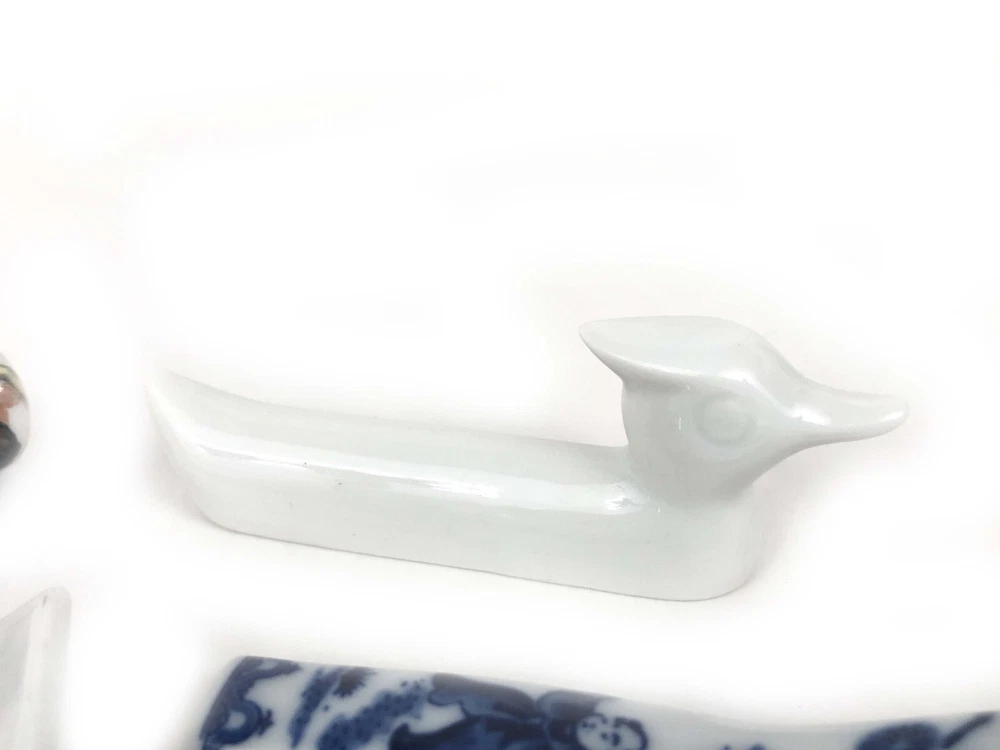 This set of 9 knife rests features an Asian theme with porcelain and china in the shape of children, ducks, fans, and bamboo. Each knife rest is uniquely crafted and perfect for adding a touch of elegance to your dinner table. The origins of these knife rests are unknown, adding to their intrigue and charm. Whether you are a collector of unique dining accessories or simply want to impress your guests, these knife rests are sure to be a conversation starter. They are versatile enough to be used for other types of utensils, such as chopsticks or spoons. This set falls under the categories of Other Dinnerware & Serveware, Dinnerware & Serveware, Kitchen & Home, and Collectibles. If you are looking for a unique and elegant addition to your dining collection, these knife rests are the perfect choice.