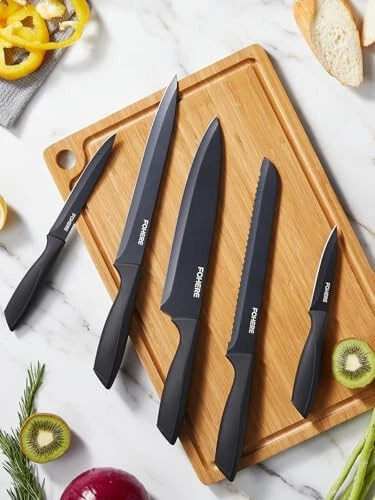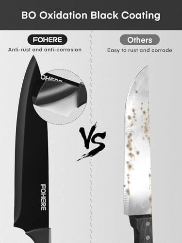 Knife Set, 13-Piece Kitchen Knife Set with Block Wooden German Stainless Steel Description:- 13-piece Knife Set Includes: 8" chef's knife, 8" slicing knife, 8" serrated bread knife, 5" utility knife, 3.5" paring knife, 6 *4.5" serrated steak knives, 1 kitchen shear, PP knife block with built-in knife sharpener Exclusive Integrated Sharpener: With a sharpener, cutting, chopping, dicing or slicing will be fast and smooth with the durable and perfectly sharp kitchen knives. You don't even need to worry about where to find a separate sharpener stone Professional Anti-Rust Black Coating: Our BO Oxide technology prevents the steel from oxidizing, ensuring years of anti-rust performance. And will not cause damage despite the high intensity impact of the dishwasher Anti-slip and Soft Handle: The black frosted textured PP handle ensures a comfortable experience and won't slip when your hand gets wet. No fatigue even after long hours of cooking Easy to Clean: The holes of bottom of knife block makes it easy to drain after cleaning and keep your cabinets clean. This kitchen knife set is perfect for professional and amateur chefs.