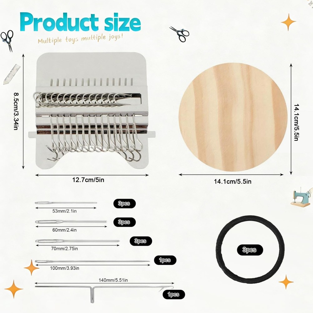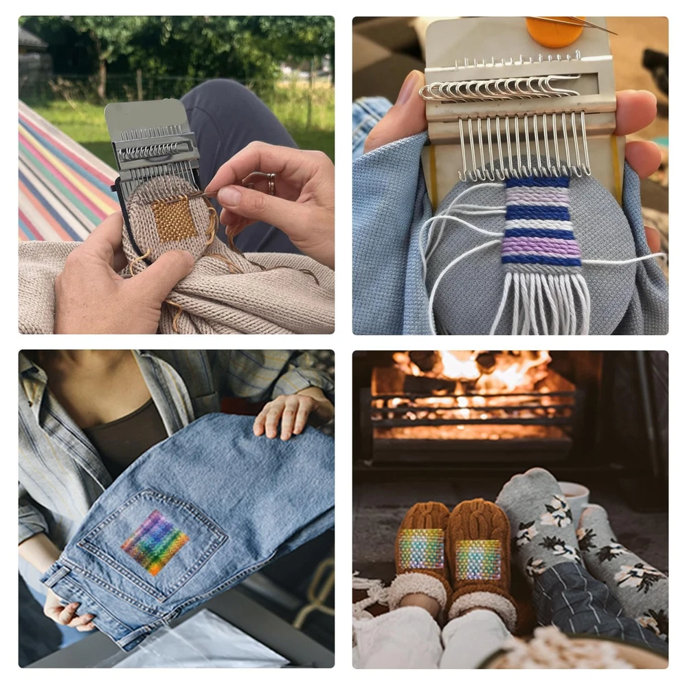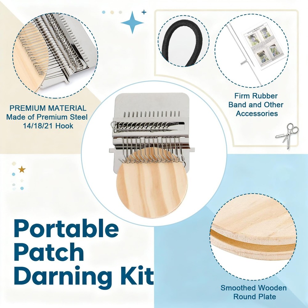 21 Hooks Quickly Repair Holes, Tears & Worn Areas: Our knit patch kit is designed for efficient repairs on jeans, sweaters, socks, and more. The darning loom creates a strong woven patch in minutes, saving your favorite clothes from the landfill Beginner-Friendly with Easy Instructions: The Patchmaker 2.0 kit includes a clear, step-by-step guide. Anyone can start mending like a pro—no prior experience needed. Master the art of knitpatch repair on your first try Compact & Portable Design: Unlike bulky traditional looms, this knitpatch kit is small enough for your crafting bag or suitcase. Perfect for quick fixes at home, on trips, or in your workspace Unleash Creativity & Personalize: Go beyond basic mending! Use this knit patch kit to add colorful designs, patterns, or embroidery to garments, turning every repair into a unique fashion statement Durable Build & Perfect Gift: Crafted from quality wood and stainless steel, this sturdy darning loom is built to last. Presented in an attractive box, it makes a thoughtful and practical gift for crafters and eco-conscious friends