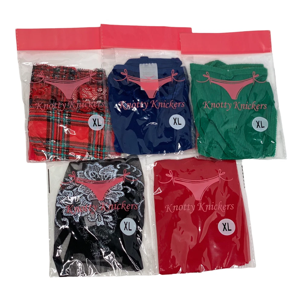 New ~ Knotty Knickers ~Set of 5 Panties Sz XL Multicolor Thongs Cheeky Lace SEXY #2184 Please refer to photos and enlarge for better viewing