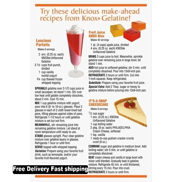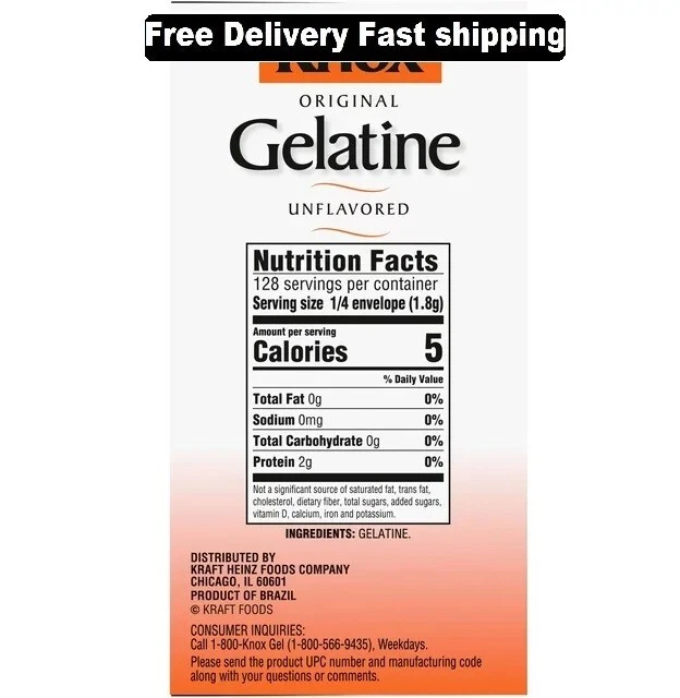 Knox Original Unflavored Gelatin (32 Ct Packets)~ Brand New Item. Free Fast Shipping . Products Description: Knox Unflavored Gelatin is perfect for making a wide variety of desserts. This unflavored gelatin powder gives you the classic gelatin texture you know and love while letting you add your own unique flavors to your dish. With zero carbs and 5 calories per serving, no sugar gelatin is a great dessert ingredient for all your favorite recipes. These gelatin packets come individually sealed for lasting freshness until you're ready to enjoy. Unsweetened gelatin is a very useful thickening agent that's great for making parfaits, cheesecake or homemade marshmallows. You can also use fruit juice to flavor the gelatin for a classic treat for kids and adults. This 8 ounce box contains 32 envelopes. About this item: · One 8 ounce box of Knox Unflavored Gelatin · Knox Unflavored Gelatin is plain gelatin that's perfect for making a wide variety of desserts · Contains zero carbs and 5 calories per serving · Gelatin packets come sealed for lasting freshness until you're ready to enjoy · This no carb thickener is an essential ingredient in many dessert recipes · Try making parfaits, cheesecake or homemade marshmallows · Add your favorite fruit juice to make a classic fruity gelatin treat Allergen-Free Statements Peanut-Free|Egg-Free|Gluten-Free|Lactose-Free|Soy-Free|Casein-Free|Dairy-Free|Shellfish-Free|Corn-Free|Milk-Free|Tree Nut-Free|Soy/Soybean-Free|Mustard-Free|Sesame-Free|Latex-Free|Silicone-Free Safe Handling Instructions Refer to product label if applicable Ingredients GELATINE Return & Exchange: We Accept return as per eBay Return Policy, Customer satisfaction is our priority. If there is a problem with your order then please contacts us, we will provide you the best solution. Return shipping is the buyer's responsibility unless the return is a result of our mistake. We will pay for shipping replacement back to you if an exchange is requested. Note: Customer satisfaction is very important to us. If you have any problem with your order, please contact us and we will do our best to make you satisfied, please do not a negative feedback before we resolve your problem, we guarantee that your issue will be solved quickly. This item cannot be shipped to AK, HI, Puerto Rico, FAA Address, APO, FPO, PO Box and outside of USA.