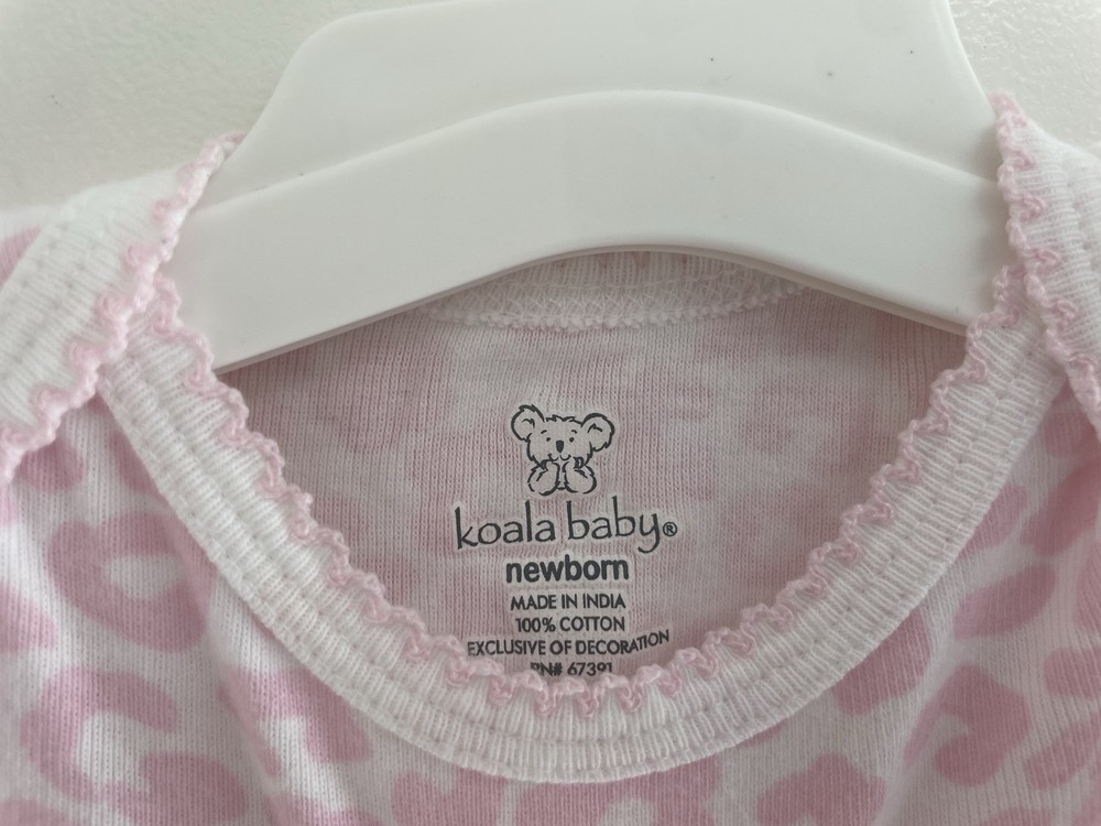 Closure: Snap Garment Care: Machine Washable Features: Comfort, Easy Care, Lightweight, Stretch Accents: Lace Brand: Koala Baby Number of Pieces: 1 Piece Style: Bodysuit Set Includes: Bodysuit Season: Spring, Summer Department: Girls Size: Newborn Color: Pink Pattern: Animal Print Type: One-Piece Country of Origin: India Material: 100% Cotton Occasion: Casual Theme: Animals Seller Notes: “In very good condition. Free of rips or stains.” Sleeve Length: Short Sleeve