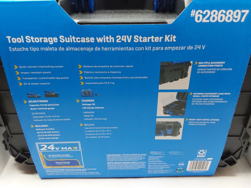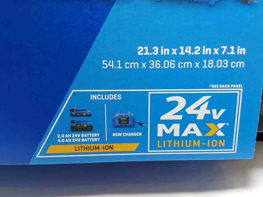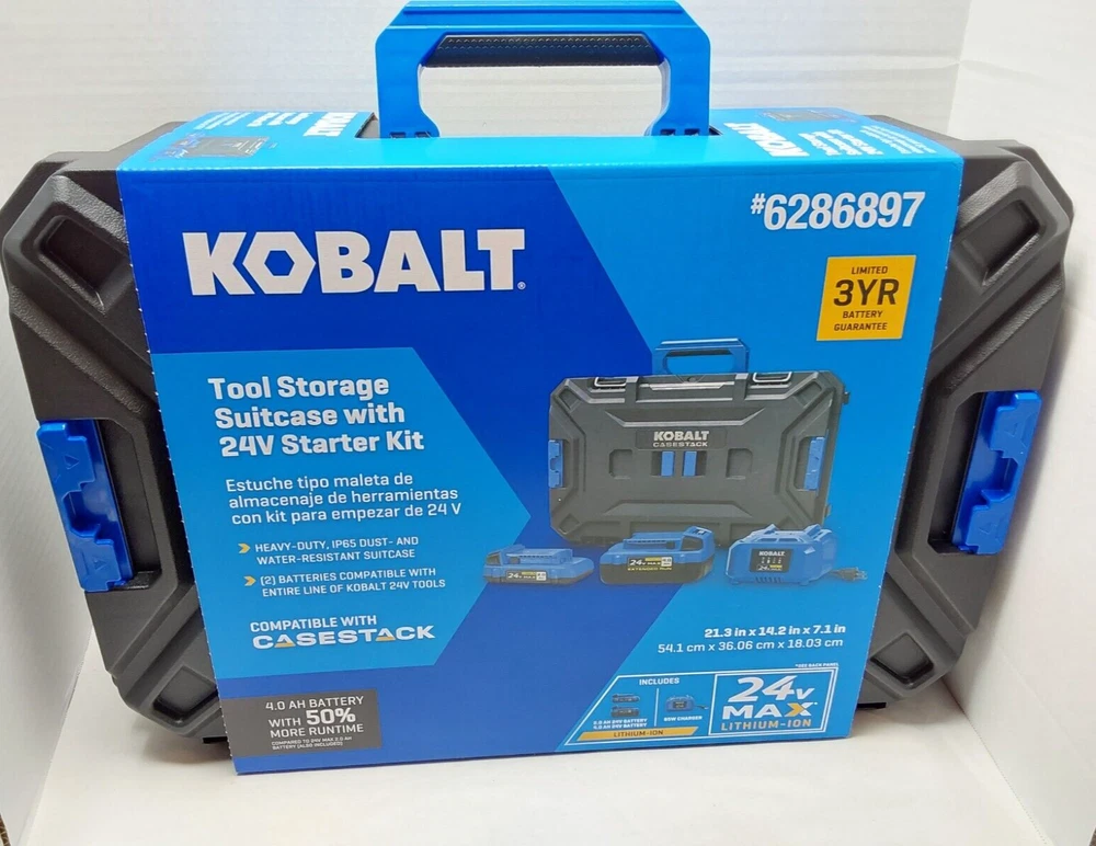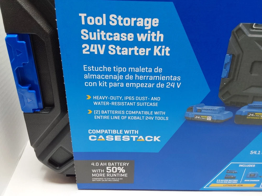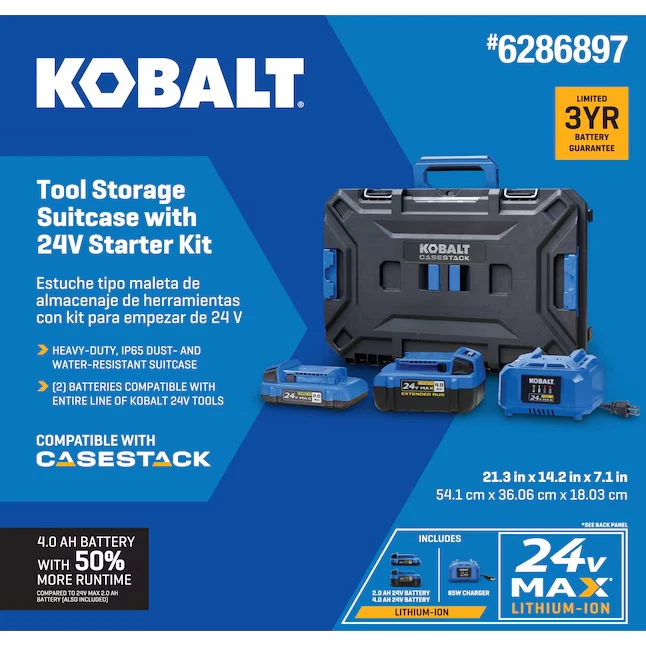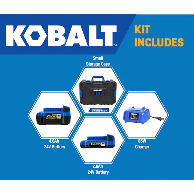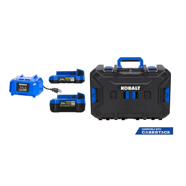 The perfect Kobalt Starter Kit to get your Kobalt 24-volt max bare tools started. The possibilities are endless! The starter kit includes a 2.0Ah battery, a 4.0Ah battery, an 85-Watt charger, and a CASESTACK small storage box. All will provide you with enough power to keep your tools working all day, and have a convenient storage box to keep them in.... Kobalt's 24-volt starter kit includes: a 2.0Ah battery, a 4.0Ah battery, an 85-Watt charger, and a CASESTACK storage box Both batteries feature a power indicator display to show the charge status whether it is on or off a tool Internal circuitry protects the batteries from extreme temperatures, over-discharge, and over-charge for longer life The 45-Watt charger will fully charge the 2.0Ah battery in 50-mins and the 4.0Ah battery in 90-mins A Kobalt CASESTACK small storage box can be used to carry your batteries and charger, or be attached to an existing CASESTACK unit Both batteries and the charger are compatible with all Kobalt 24-volt max cordless power tools (sold separately) Batteries and chargers come with a 3-year limited warranty to give you peace of mind