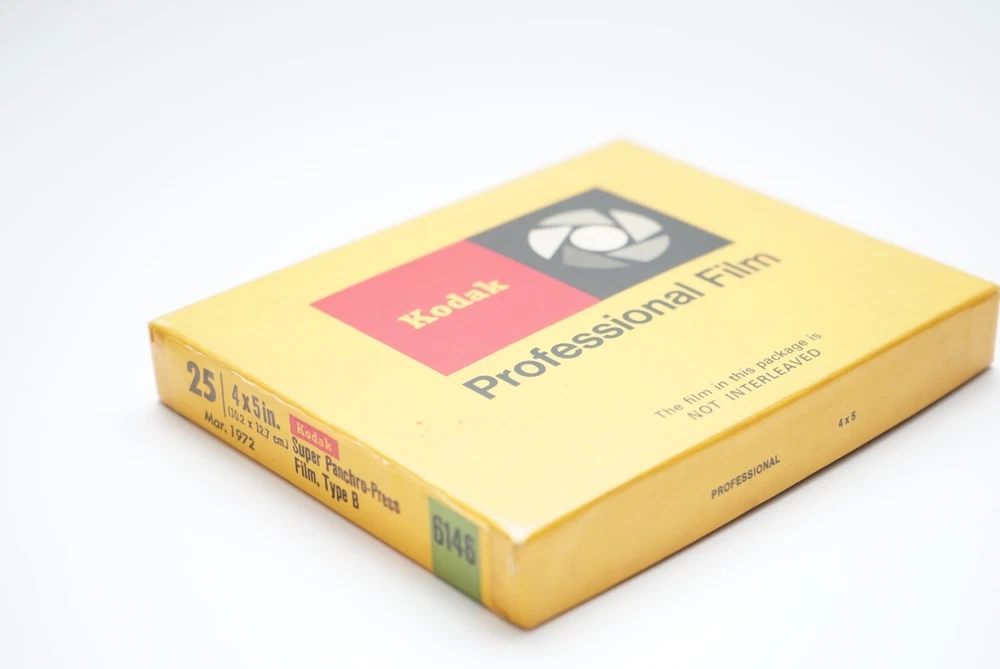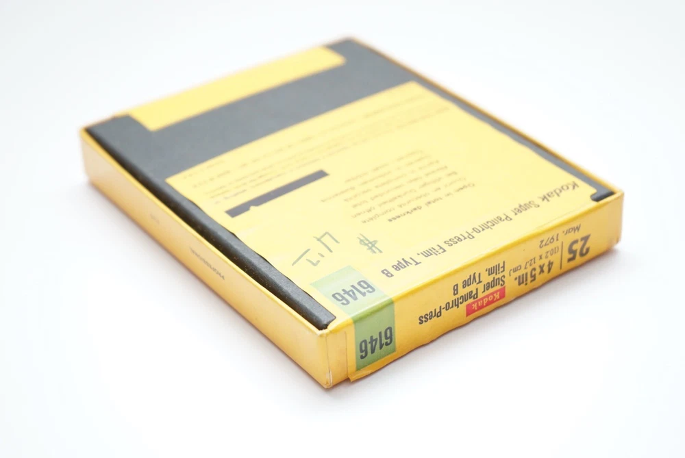 4x5 Super panchro-press film type B sheet film. Unopened and expired in Mar 1972 2 1/4 x 3 1/4 plus-x pan professional film sheet film. Opened/unknown number inside. Expired in Sept 1978