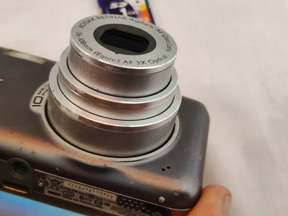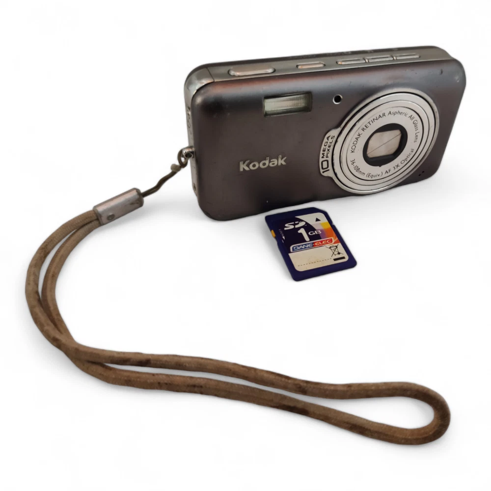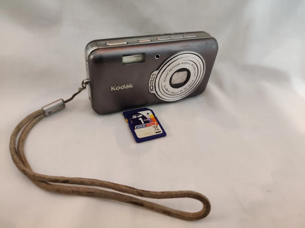 Kodak EasyShare V1003 Digital Camera in Gray. Enjoy its 10.0 MP maximum resolution and 3x optical zoom lens for crisp and clear images.has a 2.5-inch The camera is powered by a Lithium-Ion battery and can connect via USB. It comes with a 1GB SD card and battery no charger or case are included . The lens make some noises when you turn the camera on or when you shooting a video or trying to take a picture and noises can be heard when you see the video you recorded