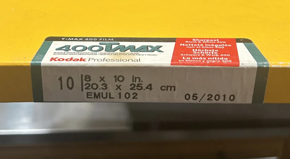 This film is known for its exceptional grain structure and is a preferred choice for photographers who appreciate the timeless look of black and white. Each sheet offers a generous 8x10 inch area. This pack contains 10 sheets and is unopened with seals intact. Dated 05/2010.