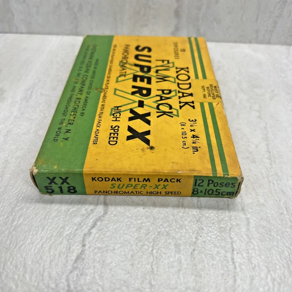 Vintage Kodak Super-XX Film Pack XX518 - 3 1/4 x 4 1/4 Panchromatic The box has wear, fading, scuffing, tearing, creasing, marks, etc. The seal is broken with open box, but the film is still wrapped in paper. The film expired Sept 1942, but would make a good display piece. My definition of condition ("ok, good, great, etc.") may be different than yours, so please review the pictures closely to judge for yourself. I typically use USPS Ground Advantage for shipping (depending on weight and cost). Note: Vintage and/or preowned items generally have some signs of wear. Pictures are a part of the description and please use the zoom function when necessary. You're buying the items "as is." I do my best to provide good pictures and accurate details, but if there is an issue please let me know. A courtesy message to me before reaching out to eBay or leaving a negative review goes a long way. Thank you! 😊