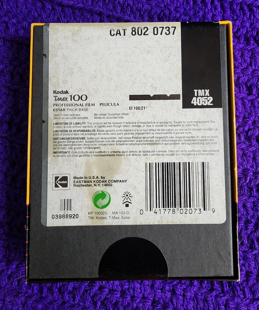 Capture the essence of vintage photography with the Kodak TMAX 100 Professional 4x5 Sheet Film. Each pack contains 25 sheets of film, perfect for enthusiasts and collectors alike who appreciate the classic feel of black and white film. The film format is standard 4x5 inches, ensuring a timeless look for your images. Kodak's renowned T-MAX series is known for its high-quality grains and the ability to render sharp details, even at higher film speeds. This roll has an expiration date of February 1997, adding a touch of nostalgia to your photographic endeavors. Unopened and sealed, it's ready to be used in your next project or collection.