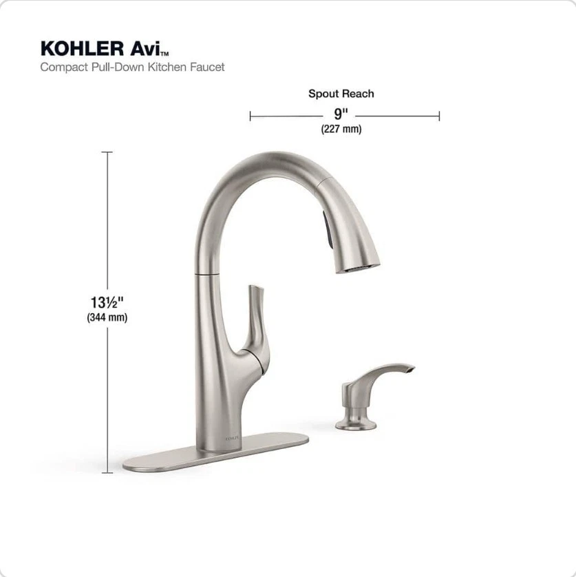 Upgrade your kitchen with the Kohler Avi R27141-SD-VS Single-Handle Pull-Out Kitchen Faucet in Vibrant Stainless. This modern faucet features a high-arc shape and a lever handle for easy use. The deck-mounted faucet is suitable for kitchen sinks and has one to four faucet holes. The Kohler Avi faucet comes with a soap dispenser and deckplate for a complete look. Made of metal, this faucet is durable and perfect for everyday use. The vibrant stainless finish adds a touch of elegance to your kitchen. Bring simplicity and functionality to your kitchen with the Kohler Avi R27141-SD-VS Single-Handle Pull-Out Kitchen Faucet.