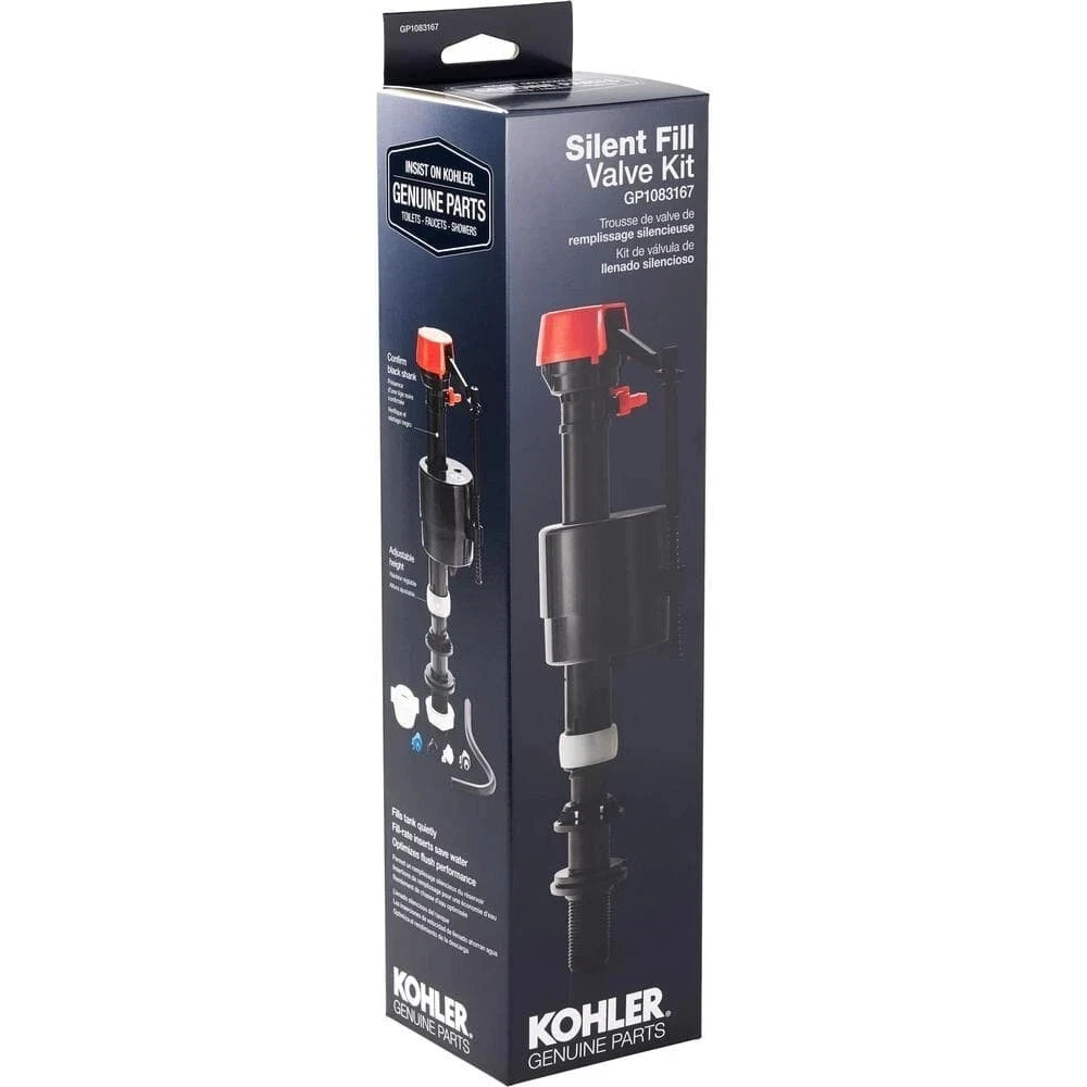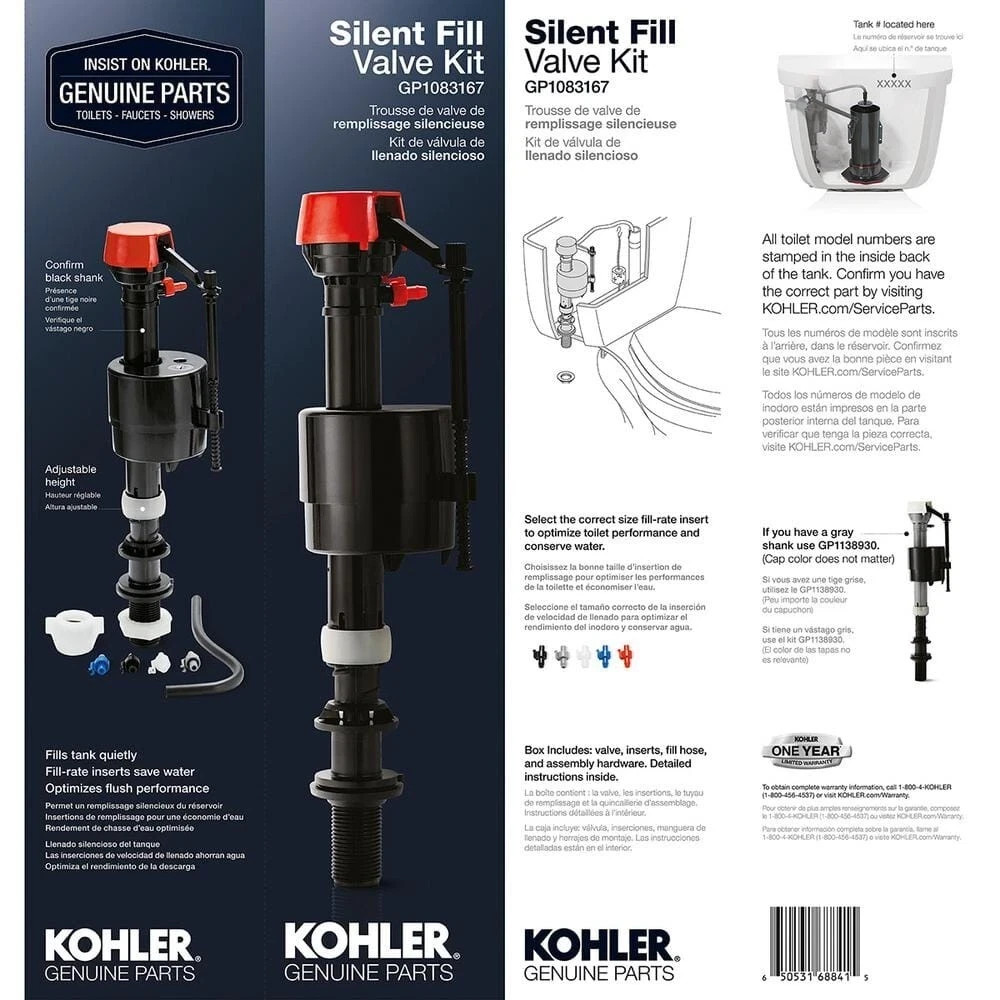 Item description from the seller Silent Fill High Rate Toilet Valve Kit | Kohler Plastic Class Parts Genuine Of always look for the KOHLER GENUINE PARTS logo. This fill valve was designed by KOHLER engineers to maintain original product performance and promote product longevity. Replace your old or leaky fill valve with an OEM KOHLER part. Silent Fill provides a gracious experience by filling the tank quietly Multiple fill-rate inserts are provided to optimize performance and conserve water Adjustable to accommodate any height Confirm shank color to determine correct part; if black, use this part and if grey, use GP1138930 Cap color may vary Compatible with various KOHLER toilets