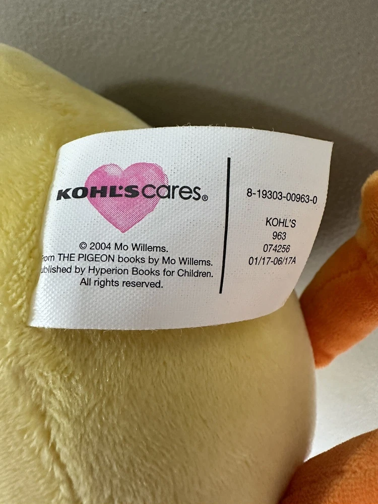 This adorable Kohl's Cares Duckling Gets a Cookie Mo Willems Plush Toy Stuffed Animal is perfect for any stuffed animal collection. With its soft and cuddly material, it is sure to bring comfort to anyone who snuggles with it. The bright yellow color and small size (6-14 in) make it a great addition to any child's toy collection. This stuffed animal is made in China and features the beloved character family of Mo Willems. It is part of the Kohl's Cares collection and is sure to bring joy to anyone who receives it. This plush toy is a must-have for any stuffed animal enthusiast or Mo Willems fan.