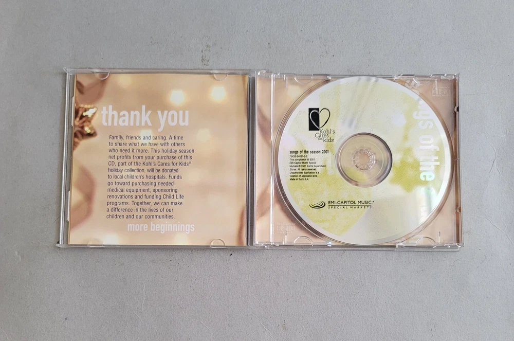 Artist:VariousRelease Year:2001Format:CDRecord Label:EMI-CapitolGenre:HolidayRelease Title:Kohl's Cares For Kids: Songs Of The Season 2001Occasion:ChristmasUPC:400830100268gtin13:400830100268Type:Album
