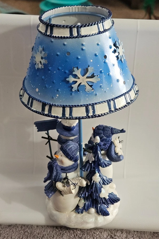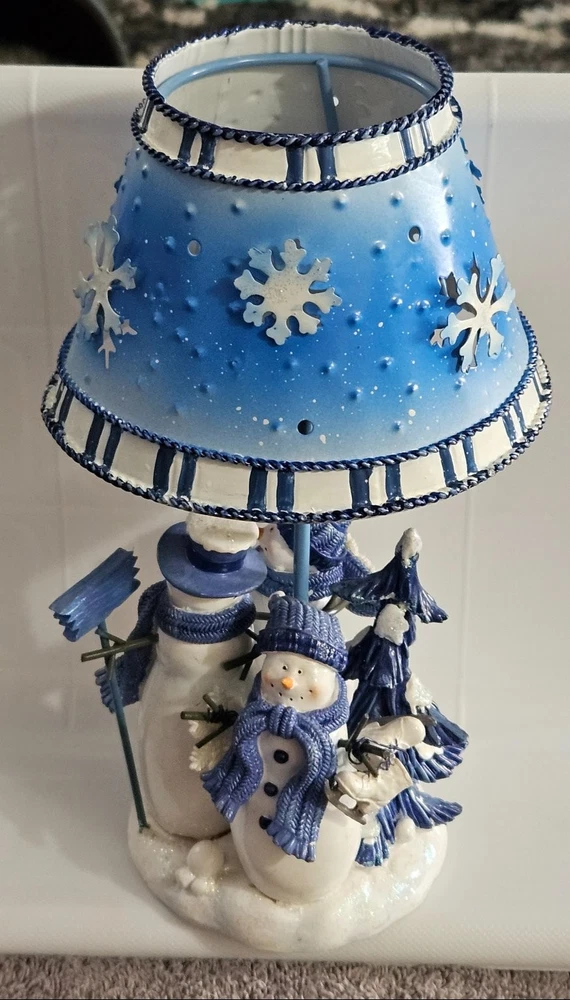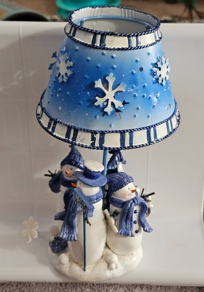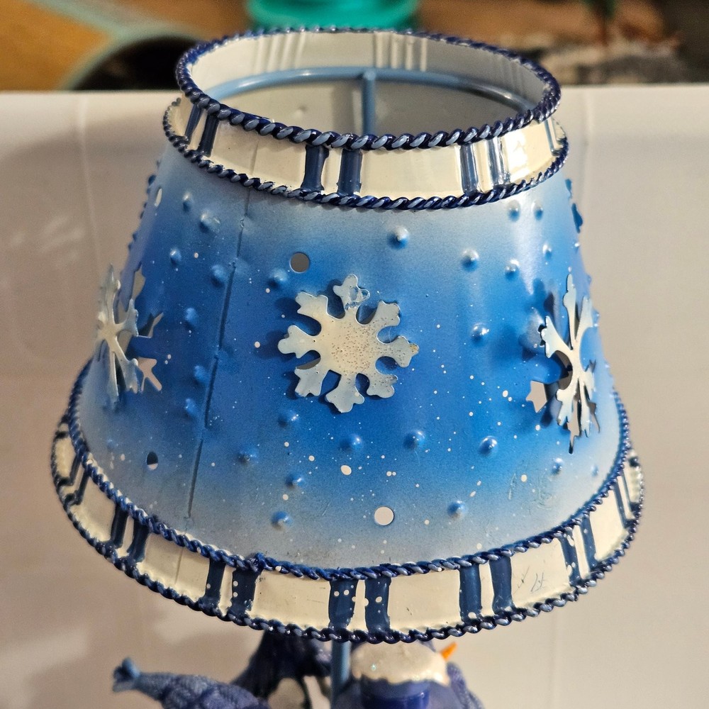 Celebrate the festive spirit with this charming Kohl's snowman candle holder, perfect for Christmas décor. Featuring two adorable snowmen dressed in cozy blue scarves and hats, this collectible captures the essence of winter joy. The snowmen stand on a snowy base accented with snowflakes and evergreen trees, all painted in varying shades of blue and white, evoking a serene winter landscape. Crafted from metal, the candle holder includes a blue metal lampshade decorated with cut-out snowflakes and a braided trim, allowing candlelight to softly illuminate the holiday scene. The piece measures approximately 7.5 inches tall, making it a delightful accent for mantels, tables, or shelves. Its "Let It Snow" sign adds a whimsical touch, enhancing its seasonal charm. Ideal for collectors or anyone looking to add a cozy winter vibe to their home, this candle holder combines festive design with durable materials and fine craftsmanship.