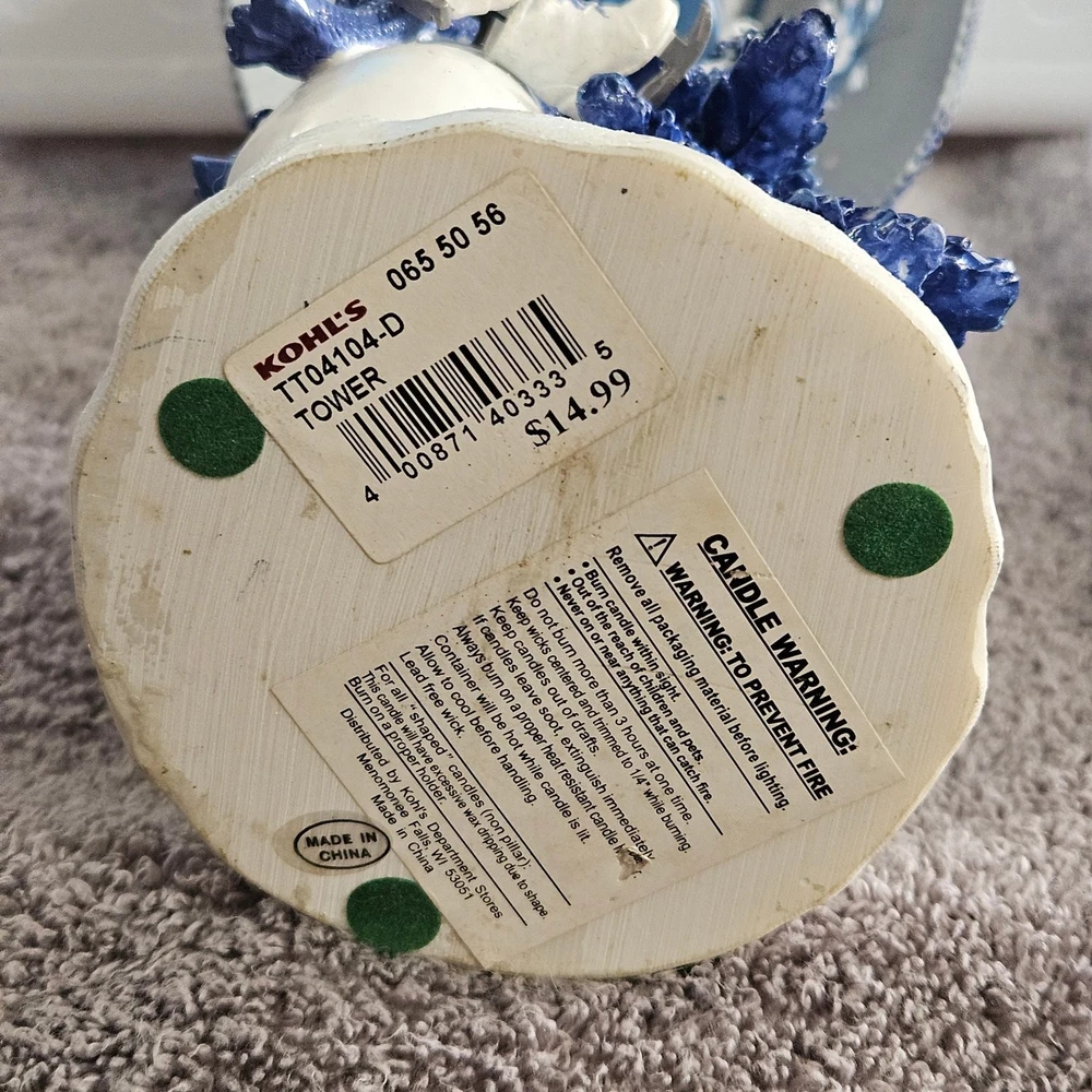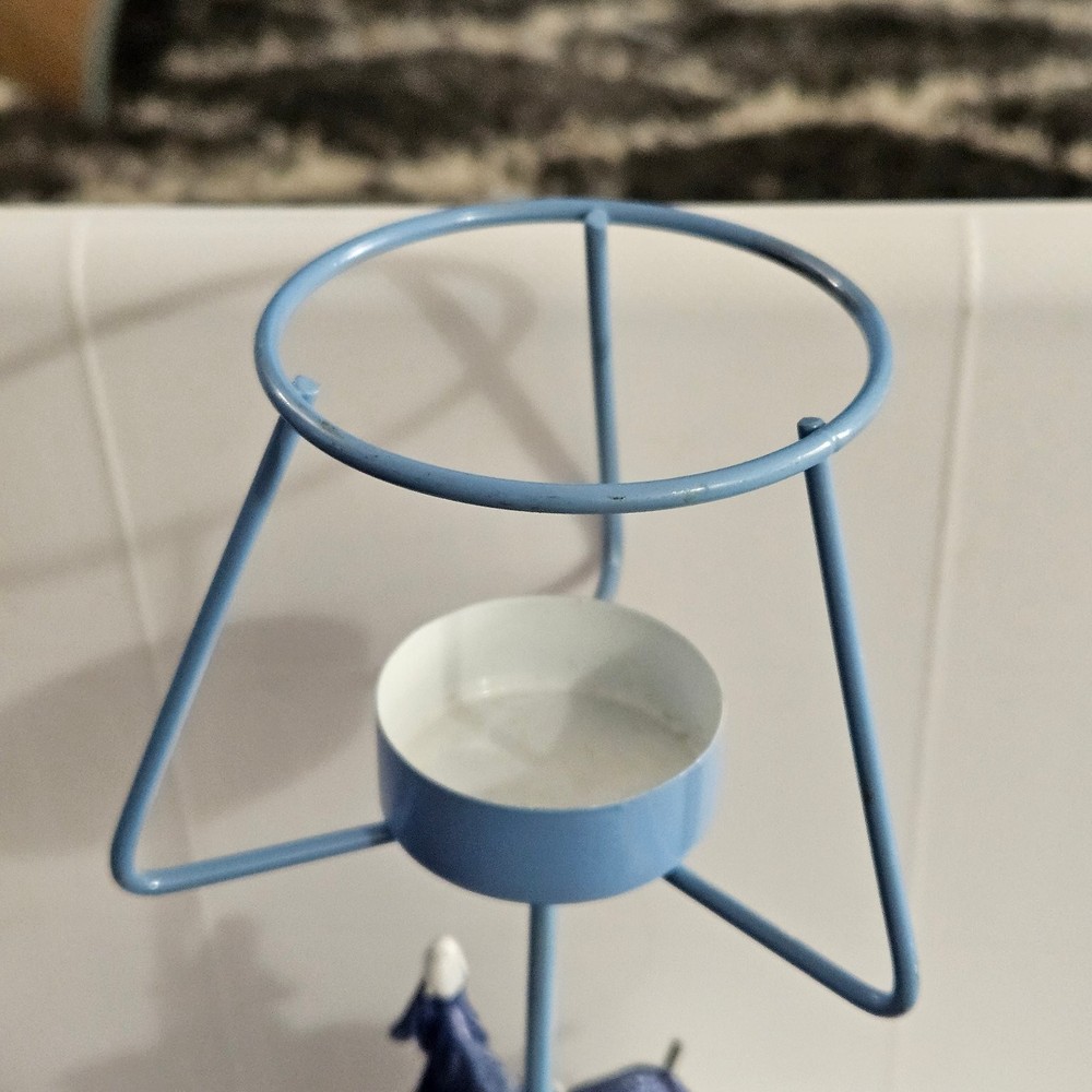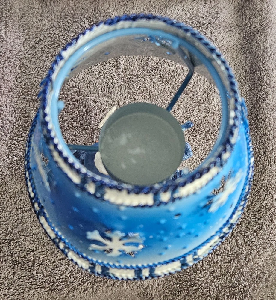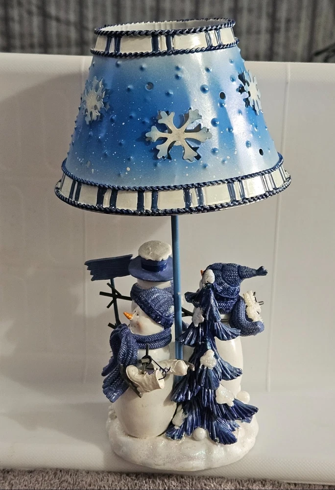 Celebrate the festive spirit with this charming Kohl's snowman candle holder, perfect for Christmas décor. Featuring two adorable snowmen dressed in cozy blue scarves and hats, this collectible captures the essence of winter joy. The snowmen stand on a snowy base accented with snowflakes and evergreen trees, all painted in varying shades of blue and white, evoking a serene winter landscape. Crafted from metal, the candle holder includes a blue metal lampshade decorated with cut-out snowflakes and a braided trim, allowing candlelight to softly illuminate the holiday scene. The piece measures approximately 7.5 inches tall, making it a delightful accent for mantels, tables, or shelves. Its "Let It Snow" sign adds a whimsical touch, enhancing its seasonal charm. Ideal for collectors or anyone looking to add a cozy winter vibe to their home, this candle holder combines festive design with durable materials and fine craftsmanship.