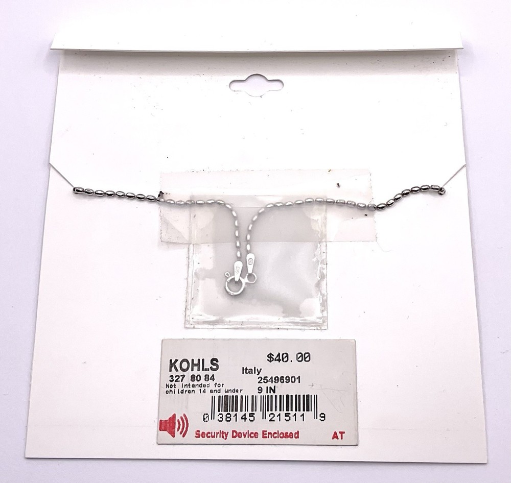 The Kohl's Summer Sterling Silver 925 Beaded Chain Linked Anklet is a stylish and elegant accessory perfect for the summer season. Made from high-quality sterling silver, this 9-inch anklet features a chic chain design with a beautiful beaded detail. The Italian craftsmanship adds a touch of sophistication to the piece, making it a versatile and fashionable choice for any outfit. Whether worn alone or paired with other jewelry, this silver anklet is sure to make a statement. We combine shipping.