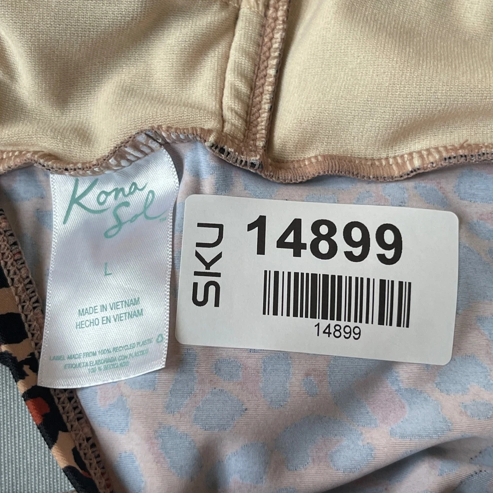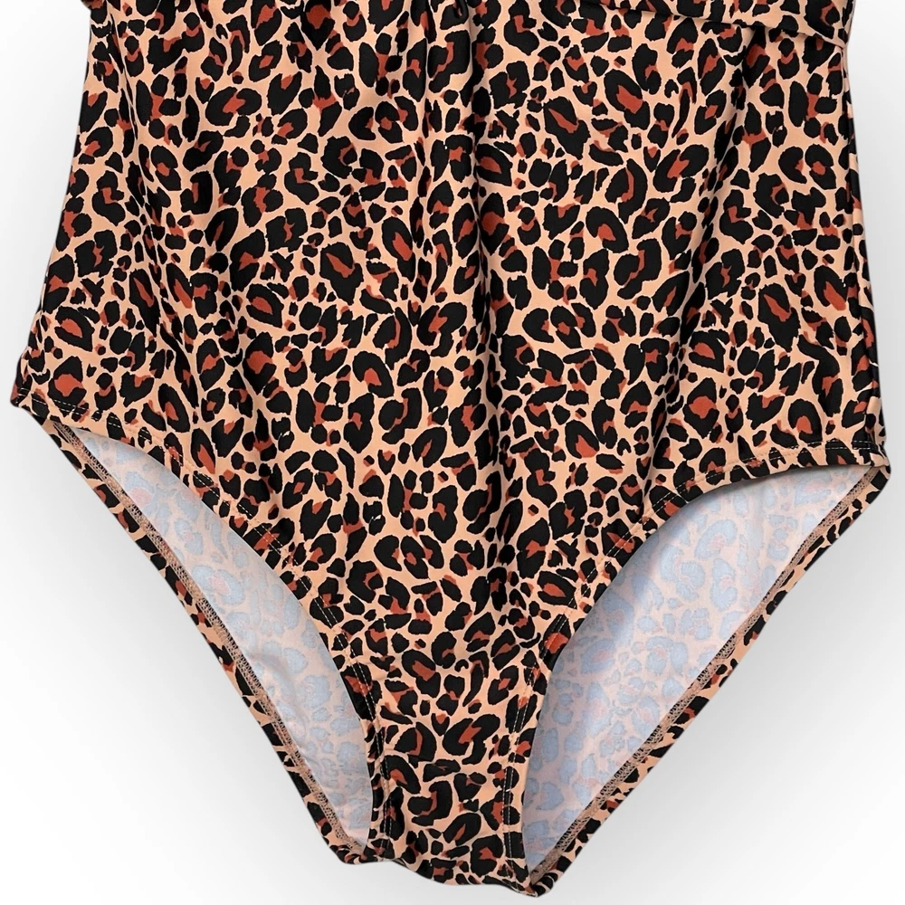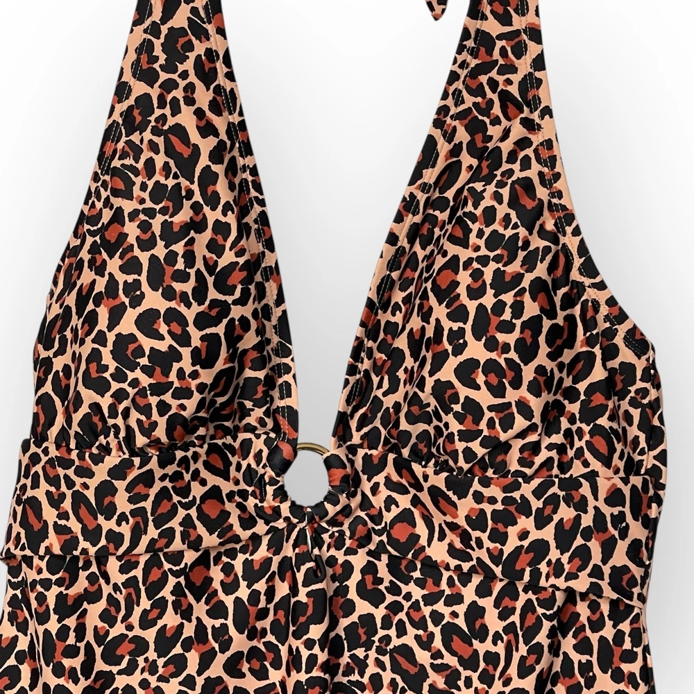 Chic one-piece swimsuit featuring a bold leopard print. This stylish swimsuit boasts a flattering halter neckline with tie closure, a plunging V-neck with a decorative ring detail, and a comfortable, full-coverage design. The built-in cups provide support and shaping, while the all-over leopard print adds a touch of wild sophistication. Perfect for lounging by the pool, swimming at the beach, or enjoying a tropical vacation. Measurements: • Pit to Pit: 15.5 in • Waist: 14 in • Length (Shoulder to Crotch): 27 in Type: One Piece Color: Beige, Brown, Black Department: Women Material: Nylon, Spandex, Spandex Blend, polyester Features: Built-In Cups, Halter Neck, Decorative Ring, Full Coverage, Tie Closure Pattern: Animal Print Accents: Ring Strap Type: Halter Keywords: one piece swimsuit, leopard print, halter neck, swimwear, bathing suit, womens swimsuit, Kona Sol, size L, beachwear, poolside, vacation, summer, animal print swimsuit, recycled materials