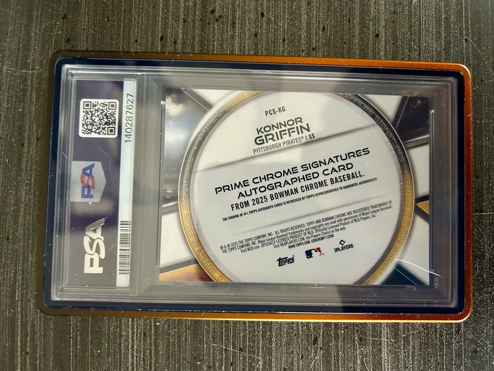 The product is a 2025 Bowman Chrome Prime Auto Orange trading card featuring MLB player Konnor Griffin of the Pittsburgh Pirates. This autographed card is graded PSA 9 and part of the Prime Chrome Sig-Org Ref insert set, with a limited print run of 25. The hard-signed autograph is authenticated by Topps, making it a valuable addition to any baseball card collector's collection.