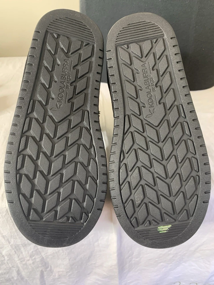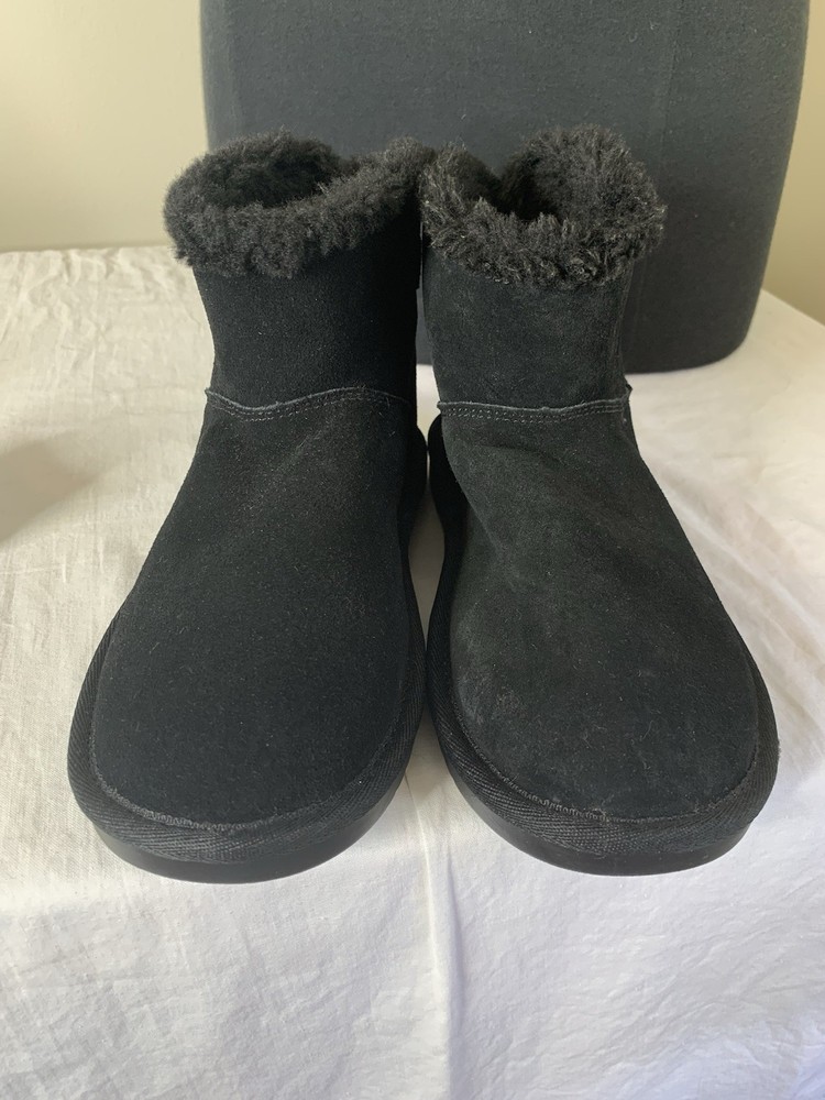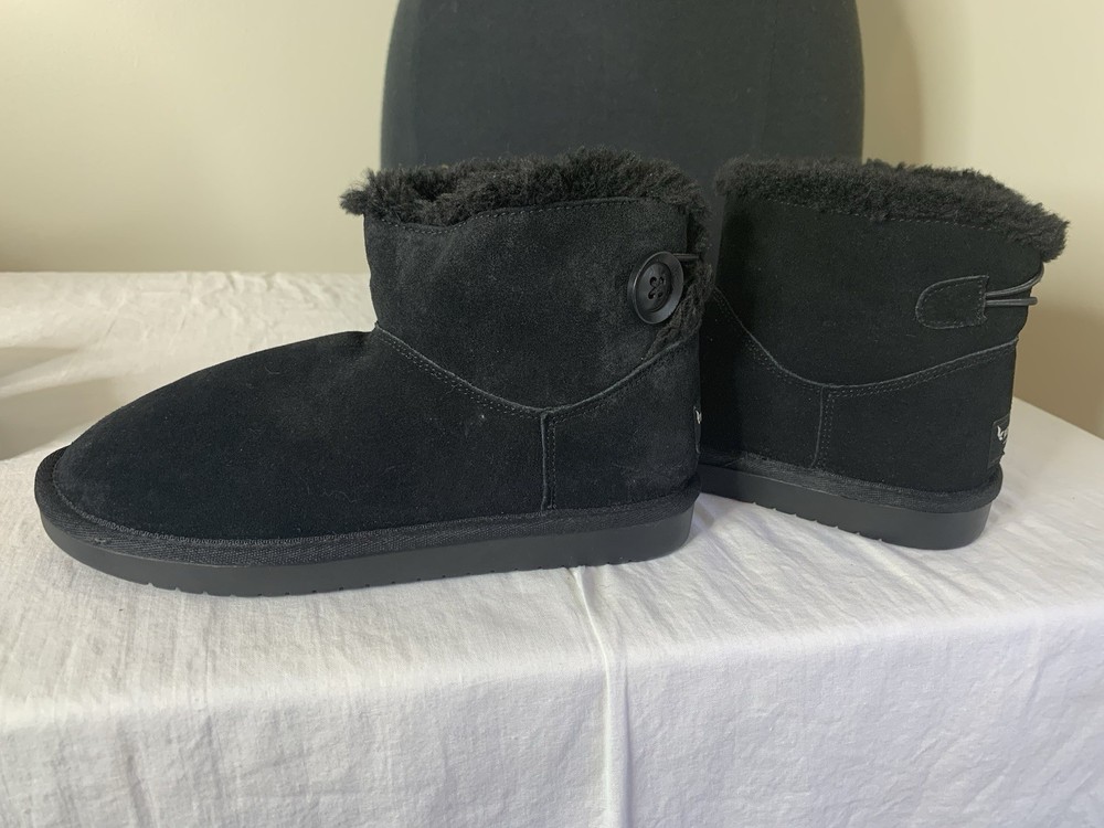 The Koolaburra UGG Boots Kid 2 Winter Black Suede Pull On are stylish and comfortable boots for unisex kids in size 2 (US) or 1 (UK). Made with black suede and featuring a round toe shape, pull-on closure, and flat heel, these boots are perfect for casual occasions in all seasons. The shearling fabric lining provides added warmth, while the ankle height and lace accents add a trendy touch. With a rubber cleat type and faux fur insole, these UGG boots offer both style and comfort for young wearers looking to stay cozy and fashionable.
