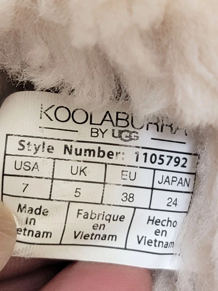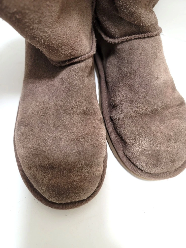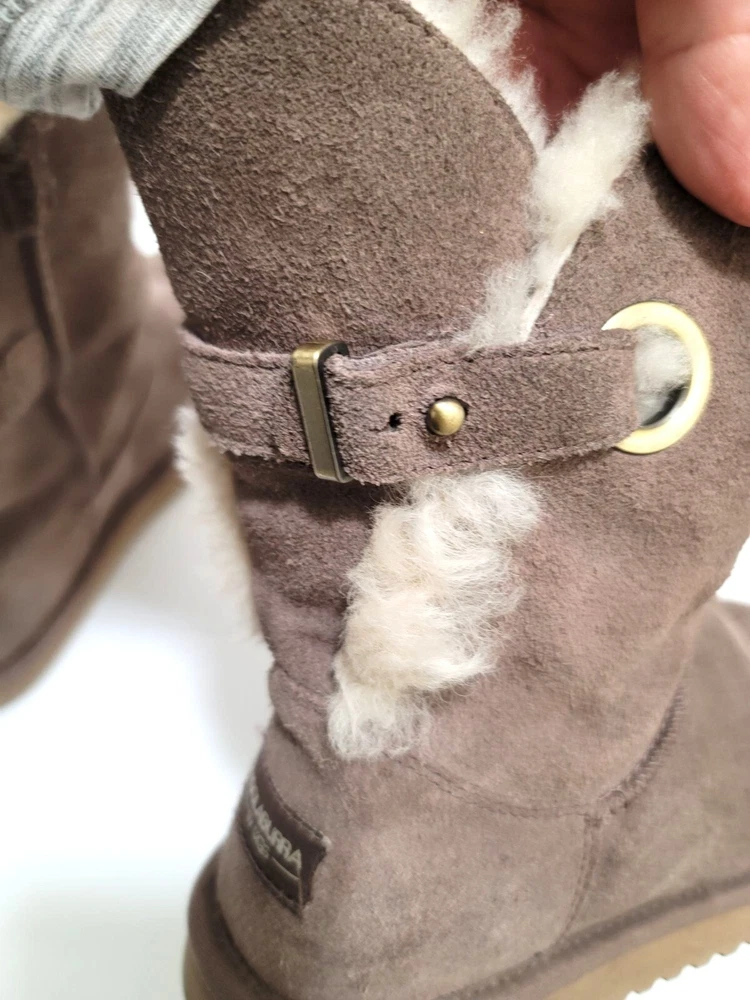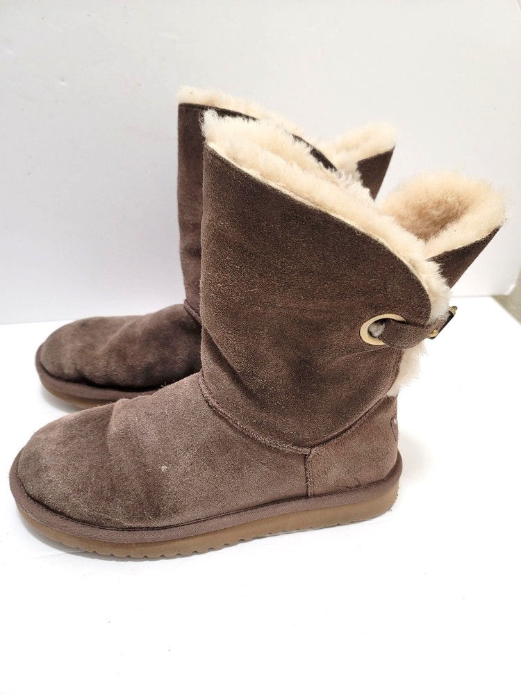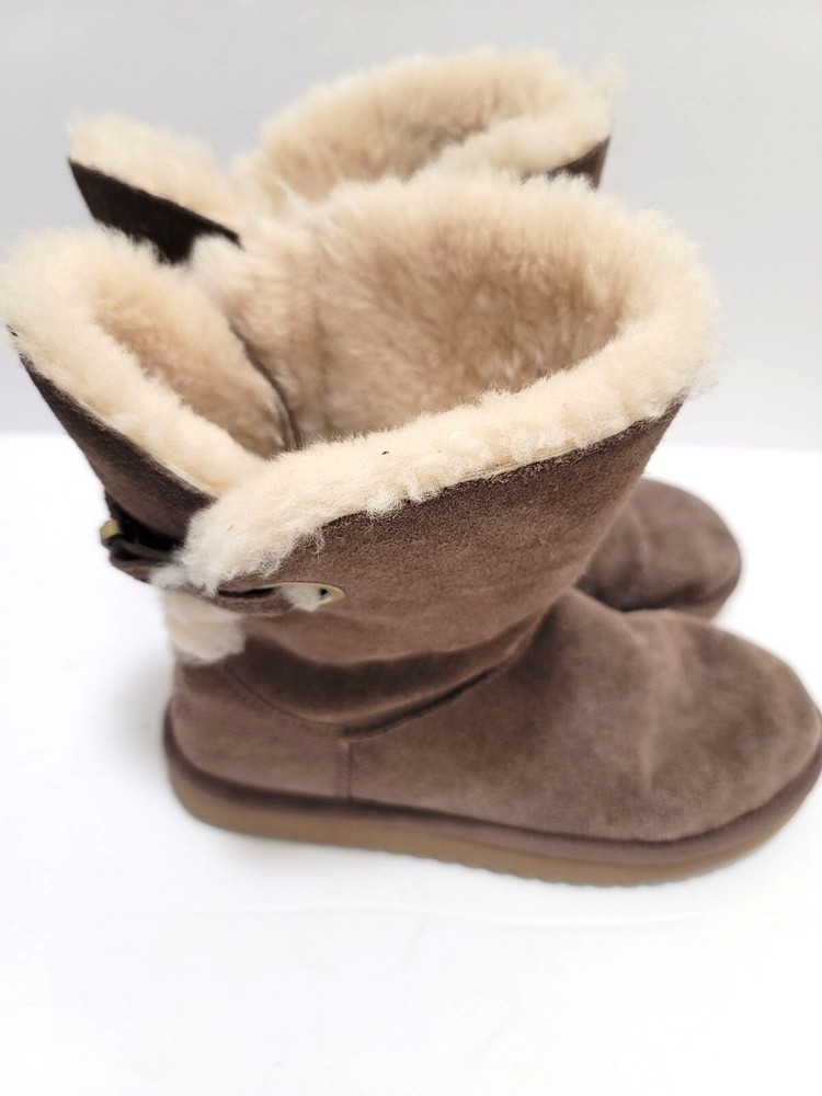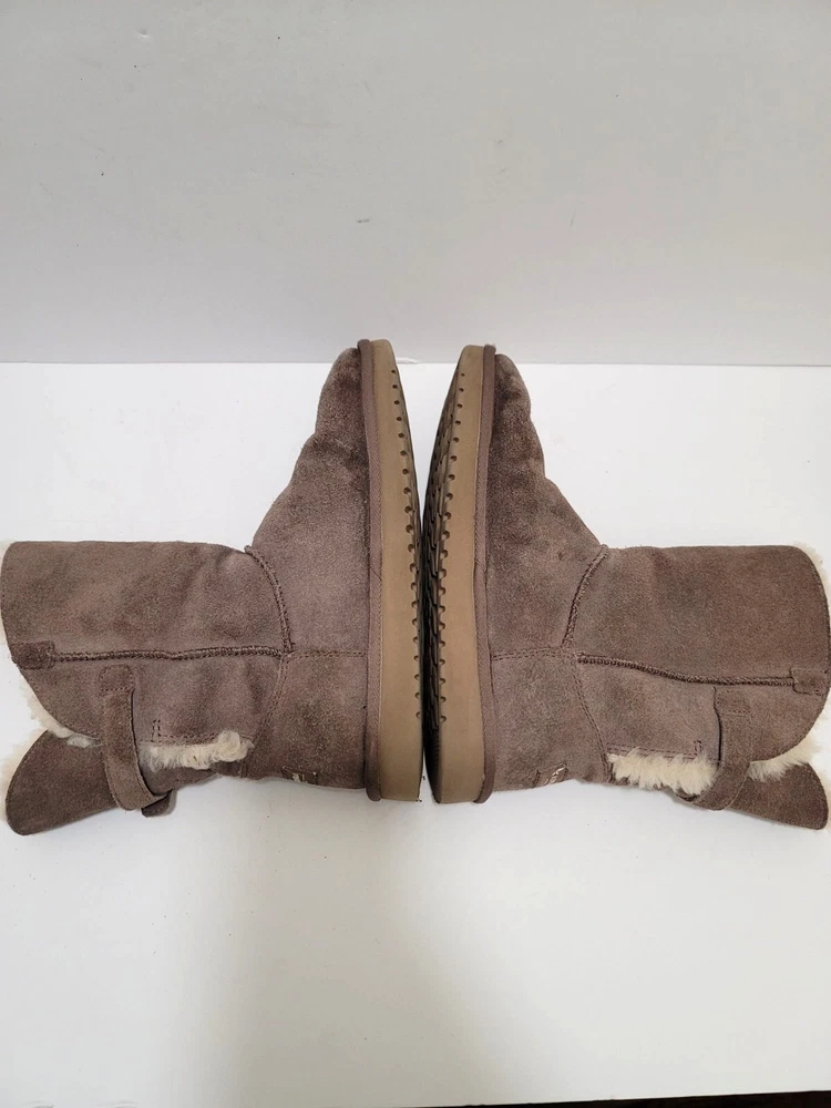 These Koolaburra by UGG boots offer a luxurious feel with genuine shearling lining. Crafted from soft suede, they provide warmth and style for cooler seasons. Durable construction ensures long-lasting wear, while the neutral brown complements various outfits. Ideal for both casual and more polished looks. • Genuine suede upper • Shearling lining for warmth • Pull-on style • Round toe design • Durable rubber sole • Decorative buckle detail CONDITIONS use, good condition. some water stains. Light wear on soles and slight creases on the upper. see photos for flaws details.