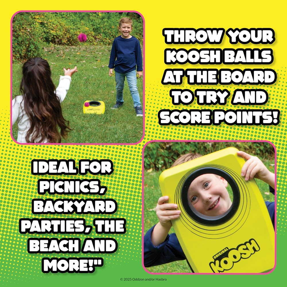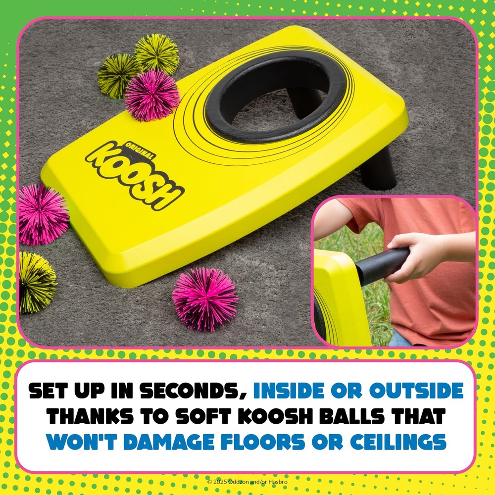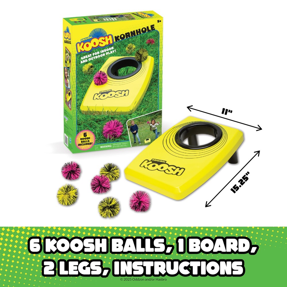 Koosh Kornhole: Throw your Koosh balls at the board to try and score points! Indoors/Outdoors: Set up inside or outside thanks to soft Koosh balls that won't damage floors or ceilings! Kid-Sized Fun: Koosh Kornhole comes with a board that's perfect for kids to set up and play, ages 5 and up! Classics With Koosh: Enjoy the classic game with a Koosh ball twist that's perfect for kids! Ready to Play: Everything you need for a game of cornhole is ready in the box! Just easily pop on the board's legs and get playing!