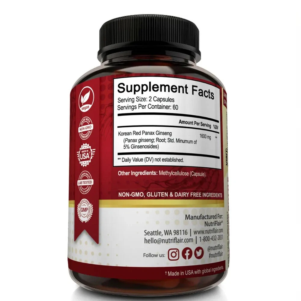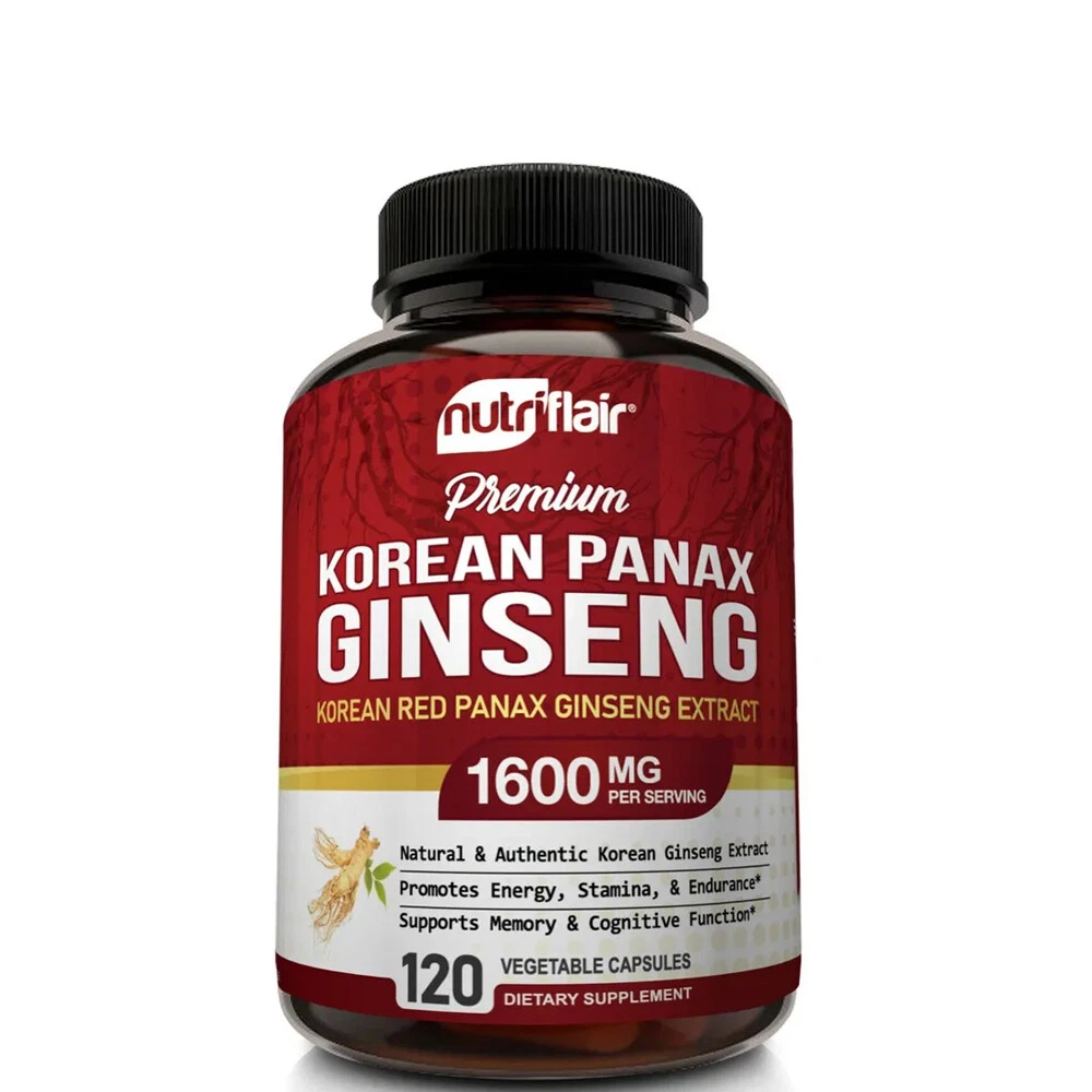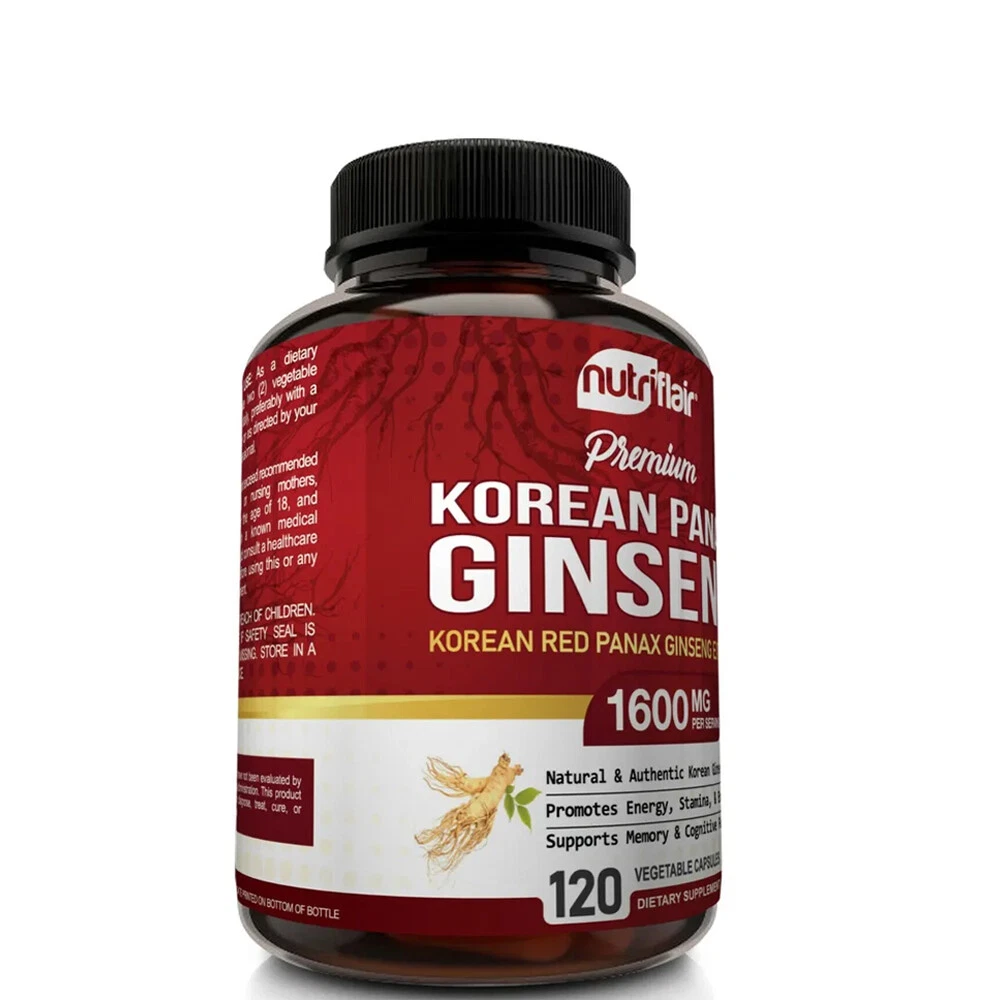 Main functions: Sexual Health,Korean Ginseng Description: KOREAN R ED PANAX GINSENG EXTRACT 1600MG: Meet the NutriFlair Korean Red Ginseng Concentrate - 120 Vegetable Capsules, with 1600mg per Serving and 5 percent ginsenosides, for Women and Men, made of Korean farm grown fresh Panax Ginseng; Helps Rev up your energy, Boost Immune System and Memory Function, Support Fatigue Recovery, Promote Blood Circulation, and improve Energy, Focus, and Performance ENERGY, FOCUS, PERFORMANCE: Korean Red Panax Ginseng is one of the most valuable herbs in the world and has been used for over 2000 years to help improve Brain Function, fight Tiredness and Increase Energy Levels, Focus, Performance, Libido, etc. Studies have also shown that Ginseng may Boost the Immune System and help maintain Blood Sugar VEGAN, NATURAL, GLUTEN-FREE, NON-GMO: Our Doctor formulated Korean Asian Red Panax Ginseng is made with 100% Natural, Vegan, Non-GMO, Gluten-free ingredients, and conveniently comes in easy to swallow vegetable capsules; It contains NO fillers, preservatives, binders, or harmful chemicals; This product is often misspelled as ginseng, gensing, genseng, asian ginseng, ginseng supplement, red ginseng FINEST INGREDIENTS: Our non-gmo, Natural Ginseng Supplement is made with the best organic ingredients available; Manufactured in the USA, in an FDA registered, approved, and inspected state-of-the-art , strict cGMP facility; Each and Every batch is 3rd Party Tested for Quality, Purity, and Potency; This includes all our Best Quality capsules, tablets, pills, supplements, vitamins, multivitamins, vegan and organic foods, powders, oils, and extracts WE GUARANTEE YOU WILL LOVE IT: Love it or simply request a refund; No Questions Asked; If our Korean panax ginseng do not bring noticeable value to you and you don't absolutely love them, simply contact us for a refund; Our world-class customer service wants you to be SATISFIED; Absolutely no risk; The bottle comes with our 100% satisfaction guarantee for 60 days; Have this all-mighty energy, mental focus, libido, performance supplement and health protector by your side and thank us later! How to take: See accompanying bottle label recommendations Specifications: 120 Caps