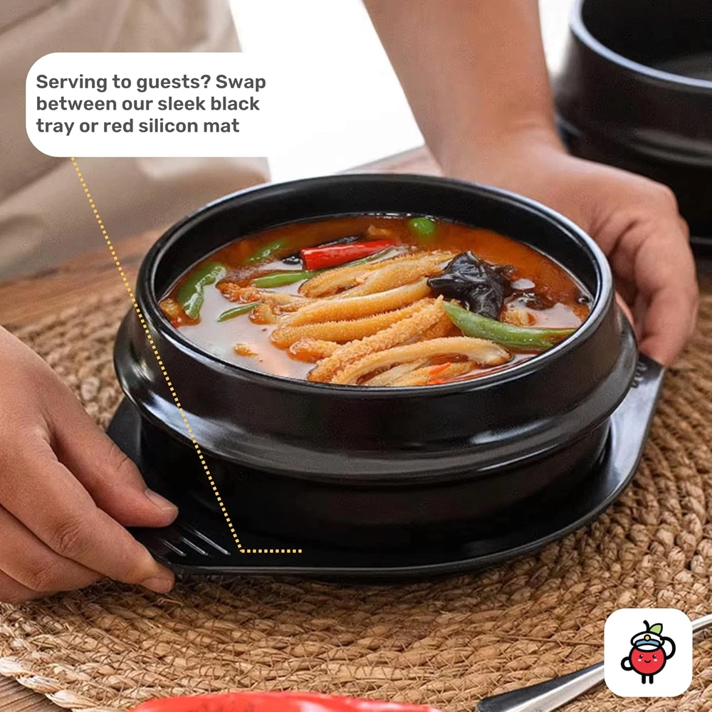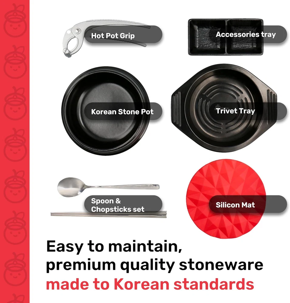Store New Arrivals Add to Favorite View Feedback Contact Korean Stone Pot Set (7-Piece, 38.7Oz with Hot Pot Grip), Ceramic Pots for Cooking, Clay Cooking Pot, Korean Stone Bowl, Earthenware Claypot, Egg Tofu Stock Soup, Bibimbap, Dolsot, Ttukbaegi Description Item model number CC0001 Manufacture Year 2024 Size Medium Number of Pieces 1 Color Black/Tan Material Ceramic Country of Origin China Is Dishwasher Safe Yes Item Weight 3.25 pounds Is Oven Safe Yes Handle Material Plastic With Lid No Utensil Compatibility Chopsticks, Spoon Special Feature Oven Safe, Microwave Safe, Dishwasher safe Product Dimensions 6.9 x 6.9 x 3.15 inches Manufacturer cookware [Elevate your culinary experience] with our Korean Stone Pot Set. Sizzle from stovetop to table, serving straight from the pot. 100% premium ceramic ensures even heating & a healthier cooking process. [Versatile cooking] From Korean bibimbap to Japanese ramen to casserole, this clay pot cookware does it all. Gas, oven, or microwave? Sure! Dishwasher safe for easy cleanup. Handwashing preferred. [Thoughtful details] Giftable pop-art premium packaging. Our extra-long (9.4") high quality stainless steel chopsticks are designed for both beginners and larger hands, ensuring a comfortable grip. [Great Value in a box] Our 7-piece set has everything you need for delicious dishes. Included aluminium hot pot grip provides a secure, non-slip hold, making transferring the korean pot safe and easy. [Extended warranty] Register for your dolsot pot set and get an additional eBook featuring mouthwatering recipes with delightful comics, inspiring you to join Captain Cranberry's culinary adventure. Product Description Introducing the 7-Piece Korean Stone Pot Set Elevate your home cooking with our authentic Korean Stone Pot Set. Crafted from premium ceramic, these versatile pots are perfect for slow-cooking Korean classics like bibimbap and stews and international dishes like mushroom risotto and french onion soup. Cook up a storm with our Korean Stone Pot Set Complement every kitchen Craving the authentic flavors and sizzling experience of a Korean restaurant? Our 7-Piece Korean Stone Pot Set is your secret to culinary excellence. Crafted with tradition in mind, these premium ceramic pots are designed to elevate your home cooking to new heights. 100% high quality ceramic Crafted from high-quality, non-toxic ceramic, our stone pot set is built to last. They also double glazed to ensure that they are non-porous and would not absorb liquids. The excellent heat retention ensures even cooking, while the versatile design is perfect for a wide range of dishes. From hearty stews to vibrant bibimbap, these pots deliver restaurant-quality results every time. Uparalleled convenience Our set offers great convenience where the versatile design allows for the pot to be used on the stovetop, oven, and microwave, making it perfect for busy lifestyles. The included hot pot grip and long, high quality stainless steel utensils enhance your dining experience, while the dishwasher-safe (except hot pot grip) make cleanup a breeze. Product Highlights Oven Safe, Microwave Safe, Gas Stove safe Scratch-resistant and Non-toxic Good Heat Retention Dishwasher Safe Exceptional Features (It's the little things that count) Searching for that perfect gift for foodies? Our packaging was custom designed in-house by our designers for that "pop-art" feel, making it an excellent choice for gifting, and perfect for kitchen and culinary explorers. Captain Cranberry stands behind the quality of our sets, register online and also get our eBook featuring mouthwatering recipes such as Korean classics like Dwenjang Jjigae, Ddukbaegi Bulgogi, and International choices like French Onion Soup. We also included more comics and surprises for you to find out. Elevate your kitchen with our stylish and functional hot pot set. Order yours today and discover the joy of home cooking! Always missing a accessory or stainless steel chopsticks? Our thoughtfully curated 7-piece Korean Stone Pot Set is the answer to the hassle of finding the correct utensils. We have carefully put together everything which you need to effortlessly prepare delicious dishes and never miss out on anything. Our complete set includes: - 100% Premium Ceramic Korean Stone Pot - Heat Resistant Trivet tray - Stainless steel chopsticks and spoon - Aluminium Alloy Hot Pot Grip - Captain Cranberry red silicon mat - Sauce Accessories tray Each set is suited for 1 person. Still using mittens or towels to bring your hot pots off the stove safely? We kept you in mind. Our hot pot grip is your kitchen's new best friend. Its ridges provide a secure grip on your pot and ensures that it stays put whilst you carry it off the stove. Avoid silicon mittens or towels which may accidentally "dip" into your delicious soup. The grip safely grips into the pot's clever overhang design to minimise spills, whilst allowing you to effortlessly transfer sizzling, delicious food from stove to table. Our Pot is also designed with grooves to safely sit on top of gas stovetops, keeping your kitchen clean and mess-free. Featuring mouthwatering recipes & delightful comics Captain Cranberry Promise Here's the secret we uncovered: Great-tasting, healthy food doesn't require a Michelin-starred chef. It just needs the right tools and a dash of inspiration. Captain Cranberry is your fearless guide, scouring the seven seas (or rather, continents) to bring you the finest, most innovative cookware. Our selection is focused on fun, innovation, and premium quality. But the journey doesn't end there! We have also meticulously curated a treasure trove of hand-selected, mouthwatering recipes to ignite your creativity in the kitchen. Join us on this extraordinary expedition! We've poured our hearts into bringing Captain Cranberry cookware to life, and we'd love for you to join us in a culinary adventure. With your help, we can turn every kitchen into a harbor for delicious adventures. ABOUT