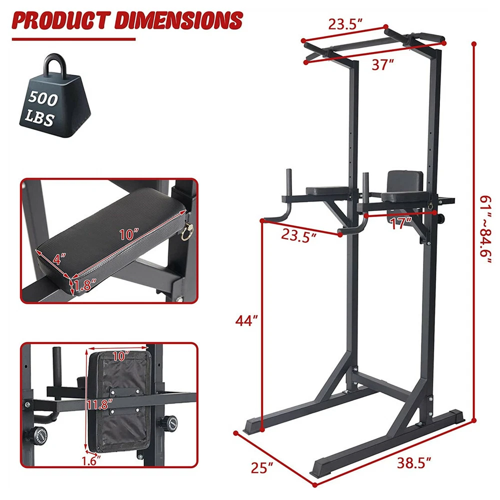 Item Weight: 55 lbs Features: Adjustable gtin13: 791590561322 Item Height: 61"- 84.6" Arm Cushion Size: 10"(L) x 4"(W) Maximum User Weight: 500 lbs Type: Home Gym Item Length: 38.5 in Color: Black Brand: Koreyosh MPN: KY0517 Sport/Activity: Gym & Training Stations: Chin Up, Dip Station, Pull Up Material: Steel Backrest Size: 10"(W) x 11.8"(H) Item Width: 25 in UPC: 791590561322 Usage: Home Use Load Capacity: 500 lbs