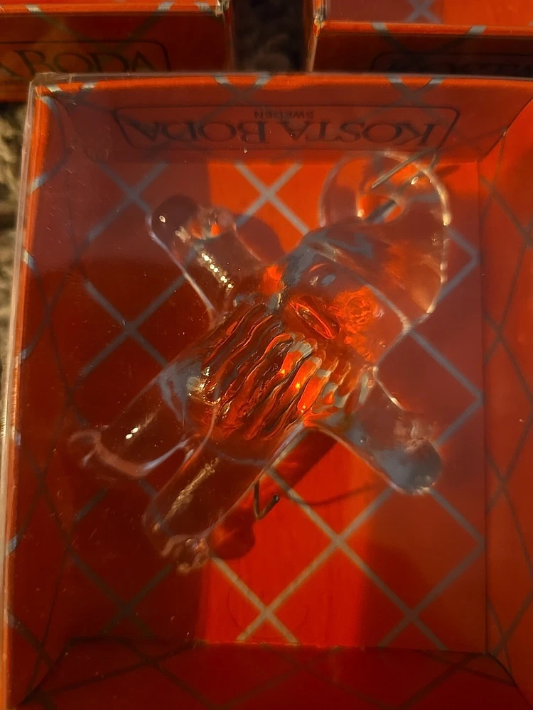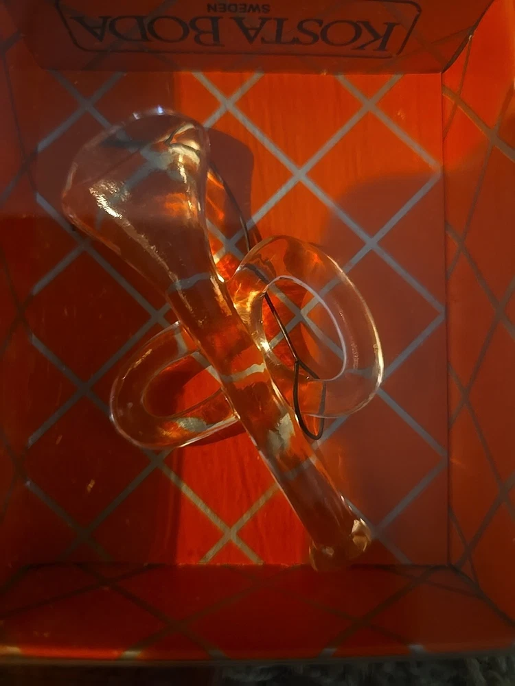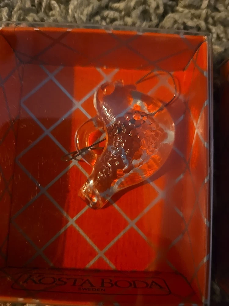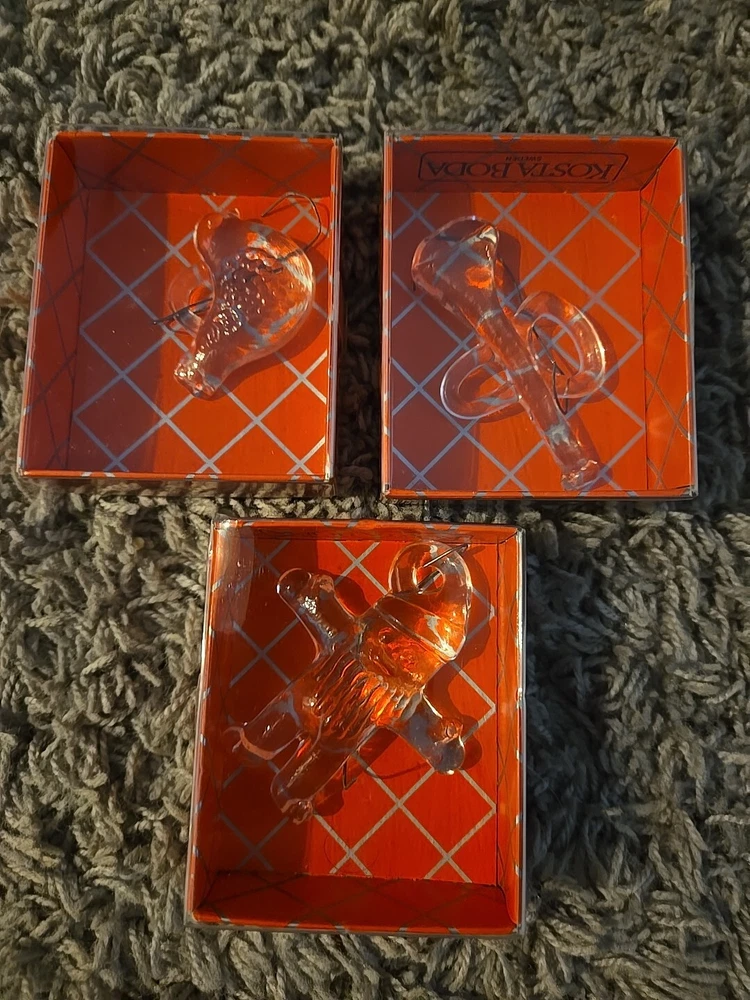 Add a touch of elegance to your Christmas tree with this beautiful Kosta Boda ornament set. The set includes three stunning glass ornaments featuring a gingerbread design, a trumpet, and a dove. The clear glass and intricate details make these ornaments a perfect addition to any holiday decor. Crafted in Sweden, these vintage ornaments are part of the Kosta Boda collection and are sure to become a cherished part of your own collection. Whether you're a collector or just looking for unique holiday decorations, these ornaments are a must-have. Celebrate the holiday season in style with this exquisite Kosta Boda ornament set.