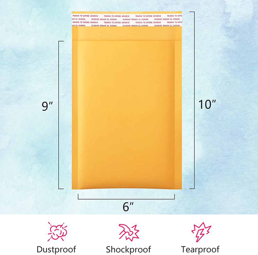 Kraft Bubble Mailers: The yellow Kraft bubble mailers outer size is 6x10 inch, while the inner size is 6x9 inch, with yellow kraft paper, which color is bright and clean. Feel nice to the touch. Extra smooth surface is perfect for handwriting, labeling and stamping. With full air bubbles, our bubble mailers can protect your value products from damage caused by external impacts Strong Self Sealing Adhesive: Our padded envelopes is using four season adhesive, which can maintain strong stickiness throughout the year, even if the weather is very hot or cold. The strong stickiness prevents your items from being secretly replaced during transportation. The adhesive is covered with silver strip, which are easily peel off the strip and seal the bag Sturdy and Durable Construction: The thicken shipping bags covers with strong kraft paper material, making them not easily punctured. Beside, the bubble bags features with excellent shockproof and tearing proof effects because of the interior built with bubble lined wall construction and the reinforce sealing on the edge. They can keep your stuff safely to destination even though using on harsh environment Convenient and Easy to Use: These yellow kraft padded envelopes are the perfect choice for small and middle business for easily using with not require extra packaging material, which can improve your company productivity at work, save much time. It is very suitable to transport for cards, CD, coin, jewelry, makeup supplies and more Enhance Brand Influence: Bright colors bring a lively atmosphere, which makes the items you transport more conspicuous and will not be easily lost. Beautiful colors can also make your customers happy and enhance your brand influence. We have been committed to making better products to serve our customers, so that their business can get better and better Product Description UCGOU 6x10" Yellow Kraft Bubble Mailers 25pcs We UCGOU is the professional manufacturer specializing in producing all sorts of poly mailers and bubble mailers. Sustainable innovation is our unremitting pursuit. Having advanced technology and equipment, we are dedicated to offering packaging and shipping solutions to our customers with excellent products and service. Padded Envelopes Protection Lined with bubble, Bubble mailers seal well and the padding is sufficient. The bubble mailer envelopes provid more protection during transit as compared to basic poly mailers and don't add too much bulk, as a result the shipping is so much better than the complicated larger packages. Enhence Company Image and Your Brand Tape, wrapping film and corrugated cardboard box. This is too much trouble when you prepare to ship somethings. It's time to say bye to the troublesome!! Come to UCGOU! Send your package in clean, simple but grand style which would help to upgrade your company professional image. Believe us. Bubble mailers with bright and pure color will allow customers to easily identify their orders from your shop when they arrive in their mail.