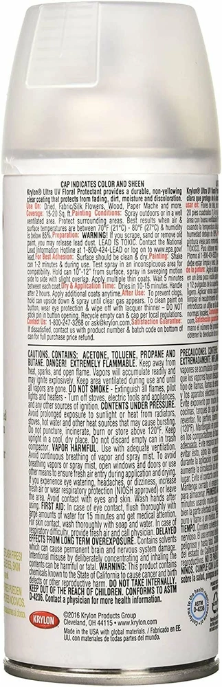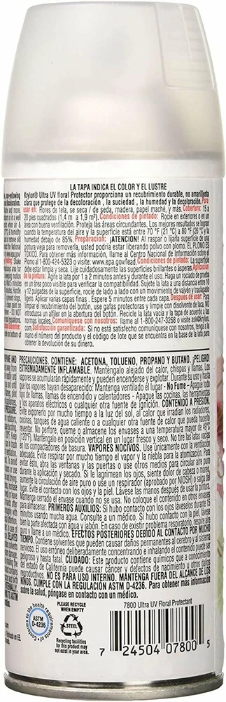 Capture the beauty of your floral collection using the Krylon floral ultra UV protection spray. With a clear, non-yellowing finish, this UV protection spray ensures that dried and silk flowers are protected from discoloration due to harsh UV rays. You can also use this flower preservation spray to avoid dirt and dust from settling on the petals. This 11-Ounce Krylon spray can be used both indoors and outdoors. non-yellowing, clear finish dry to handle: 2 hours dry to touch: 10-15 minutes clean up: lacquer thinner coverage: up to 20 sq. ft. recoat window: anytime application conditions: 70°f-85°f, humidity below 85Percent . Floral Ultra Uv Protection Spray Model Number: 7800 Country Of Origin: United States Product Dimension: 7.8"L X 2.5"W X 2.5"H