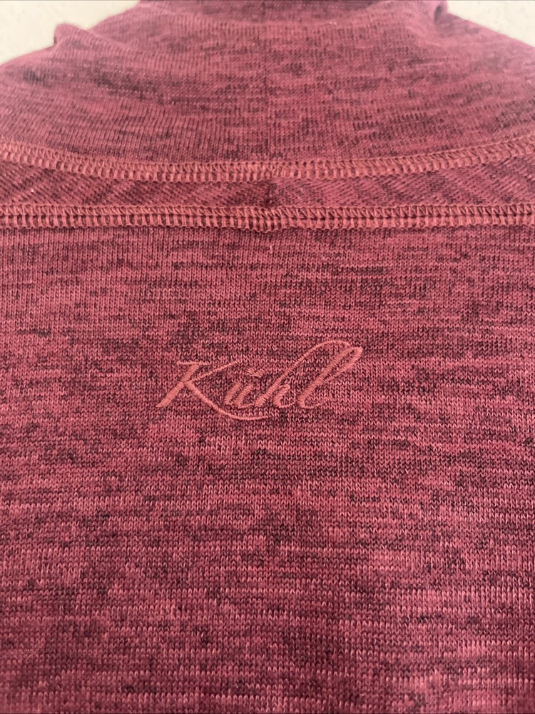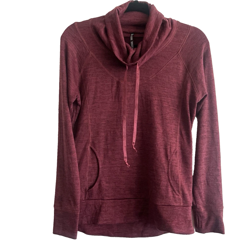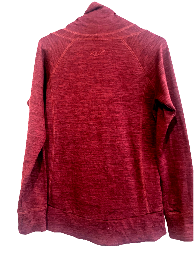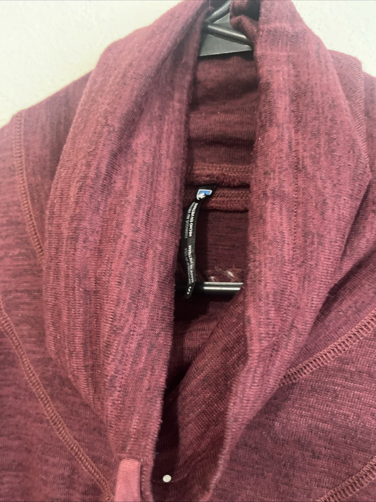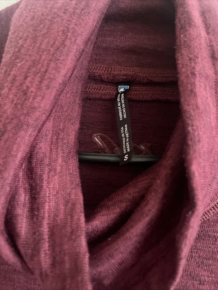 The Kuhl Lea Pullover Sweatshirt in size Small features a stylish cowl neck, tight-knit construction, and a comfortable long-sleeve design in a burgundy color. Made from a blend of polyester and spandex, this sweater is machine washable for easy care. Perfect for travel, casual outings, or workwear, this pullover sweater showcases embroidered logo accents and convenient pockets. Ideal for outdoor activities in the winter, fall, or spring seasons, this Kuhl sweatshirt offers a sporty and colorful style with a classic and timeless appeal. Chest measurements are 38 in Length 26in