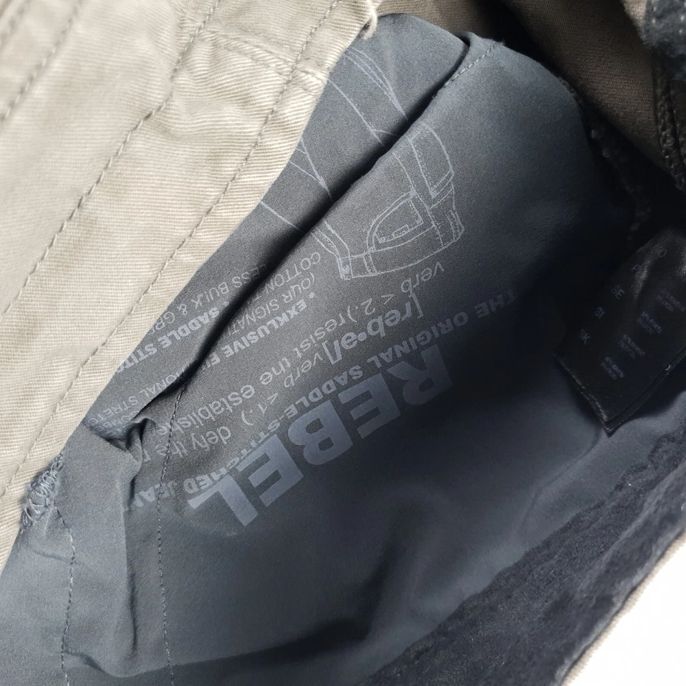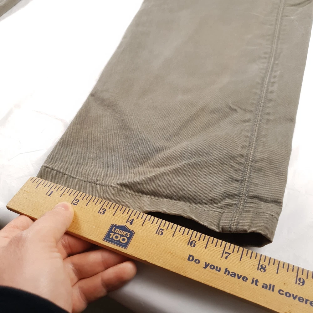 Has stains shown in photo 3 and 4. Tagged size 36x32 see photos for measurements to determine proper fit before buying. Thanks. Olive greenish gray color.