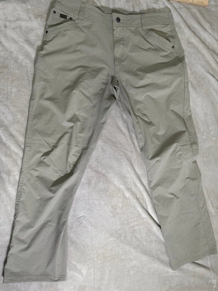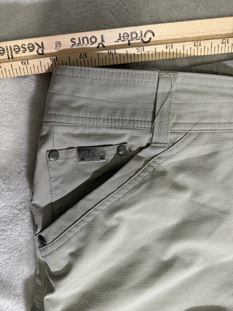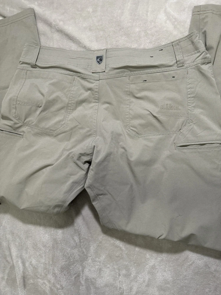 These Kuhl Silencer Pants are perfect for any occasion, whether it be for travel, casual wear, or work. Made from lightweight polyester material, these pants are ideal for outdoor activities during the summer, fall, or spring seasons. The pants come in a solid beige color and have a mid-rise fit with a straight leg style. The pants feature a 5-pocket design with a slash pocket and are secured with a zip closure and button accents. The pants also have a Kuhl logo accent. These pants are perfect for anyone who loves nature or the outdoors and want to stay comfortable while doing so.