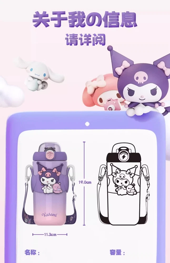 Kuromi Melody Pochacco Stainless Steel Vacuum Cup w/Hanging Rope Straw Bottle 100% high quality new brand Condition : Brand new, never been used Version: Made in China, Chinese version Insulation duration: 6 hours Set Includes: Vacuum cup,Cup strap Capacity: 500ml Material: PP, PVC, 316 stainless steel inner liner, 304 stainless steel outer shell Age Level:6 years old and above Size: 11.3*8.6*19cm Unit: cm 1cm=0.39inch 1inch=2.54cm Note: 1.Hand measurement will have discrepancy of about 1-2cm, We appreciate your understanding ! 2. The photos are all taken from physical objects, but due to different monitors, there may be slight differences between the actual object and the image. Type Vacuum Cup Brand Unbranded Theme Cartoon Material 316 Stainless Steel Features With Straw Country/Region of Manufacture China Capacity 500ml Department Unisex Baby & Toddler Keeps Hot For 6 hrs