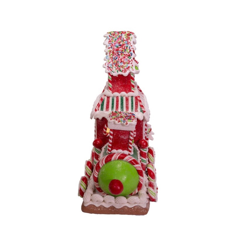 Kurt Adler Battery-Operated LED Gingerbread Train House, 10.5" PRODUCT DESCRIPTION This fun and whimsical table decoration from Kurt Adler is sure to add some life and color to your beautiful holiday display! Key Product Features LED Lit: Illuminated from within by an LED light Worry-Free Timer Function: Features a 6 hours on and 18 hours off timer Battery-operated: Uses 3 "AA" batteries (not included) Quality Craftsmanship: Made from colorful and shatterproof claydough Intricate Festive Display: Features a gingerbread train with an attached gingerbread house decorated with candy! Add a sweet touch to your holiday décor with this 10.5" Battery-Operated Gingerbread LED Train House table piece from Kurt Adler. This table piece features a locomotive shaped house with a candy design in mind. Complete with a gingerbread base, red and white candies and sprinkles this piece is glittered throughout for a sugared effect.