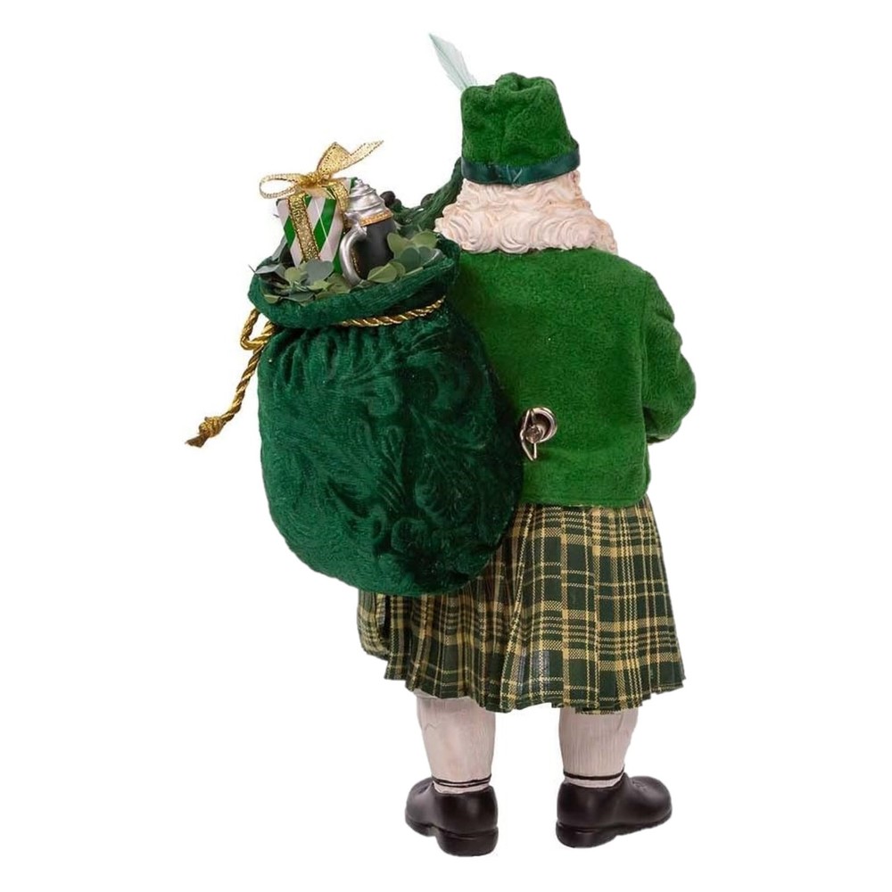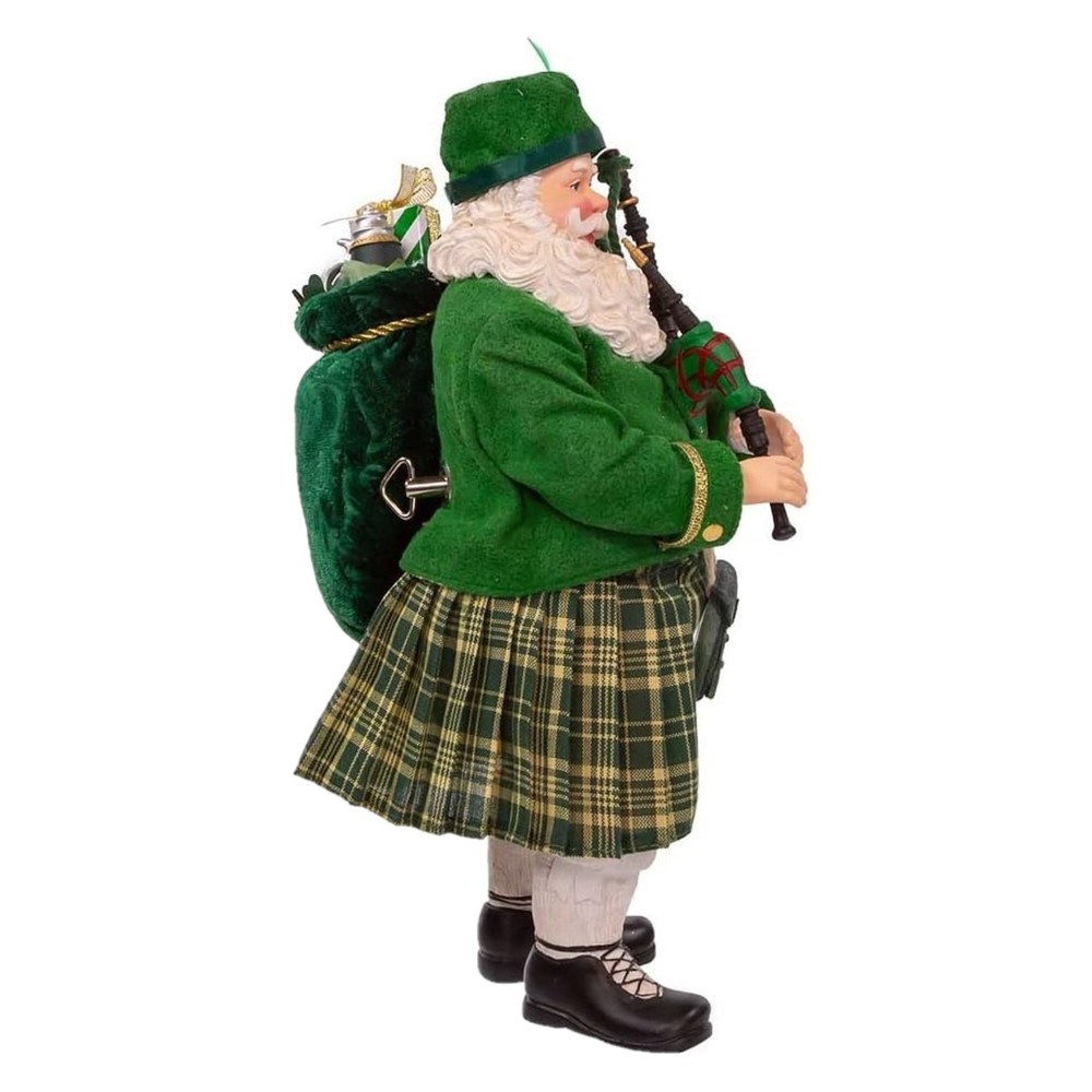Kurt Adler Fabriche Christmas Figurine, Musical Irish Bagpiper Santa, 10.5in PRODUCT DESCRIPTION Decorate your home with this festive Kurt Adler Figurine! Key Product Features This figurine is part of the Kurt Adler Fabriche Collection making it the perfect addition to your collection. Made of fabric mache, resin and PVC and plays the tune "When Irish Eyes Are Smiling" when turned on. Features Santa Claus dressed in a traditional Irish kilt with a red and green bagpipe. Brings a beautiful flair to traditional holiday décor, making it a must-have for collectors and Irish lovers. Measures approximately 10.5 inches in height. Kurt Adler figurines are known for their exceptional craftsmanship, capturing the spirit of the season with timeless charm and festive detail. Part of Kurt Adler's Fabriché collection, the Fabriché Musical Irish Bagpiper Santa is a festive and unique holiday decoration featuring a Santa Claus figure dressed as an Irish bagpiper. The Santa figure is made of a fabric material, giving it a soft and detailed appearance. He is dressed in a traditional Irish kilt, complete with a red and green bagpipe. The figure stands at 14" tall, making it the perfect size for display on a mantel, tabletop, or shelf. This charming decoration plays the tune "When Irish Eyes are Smiling" when activated. It would make a great addition to an Irish-themed holiday display. Hand-painted with shimmering mica accents, it brings Santa Claus to life on your holiday décor.