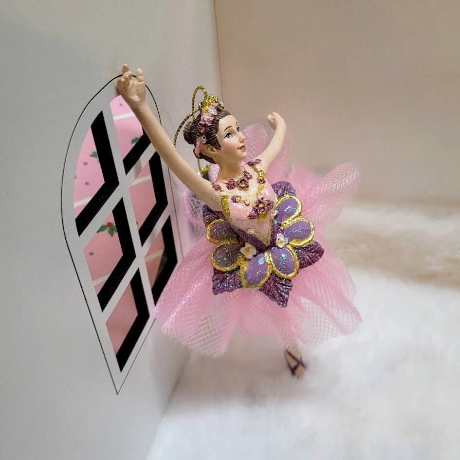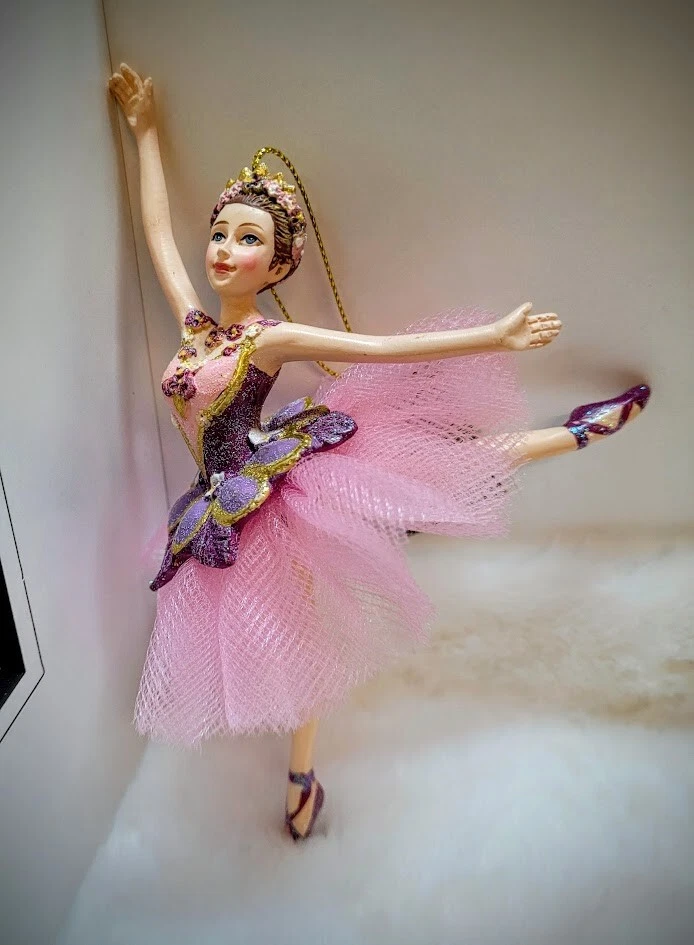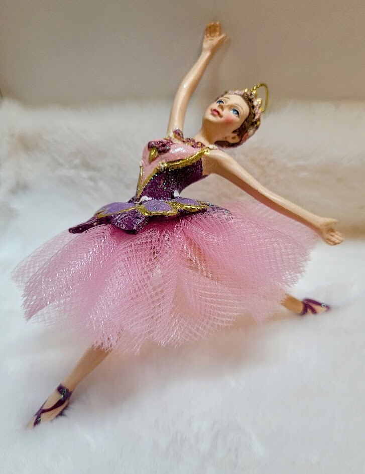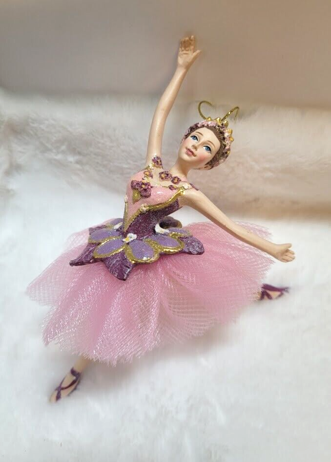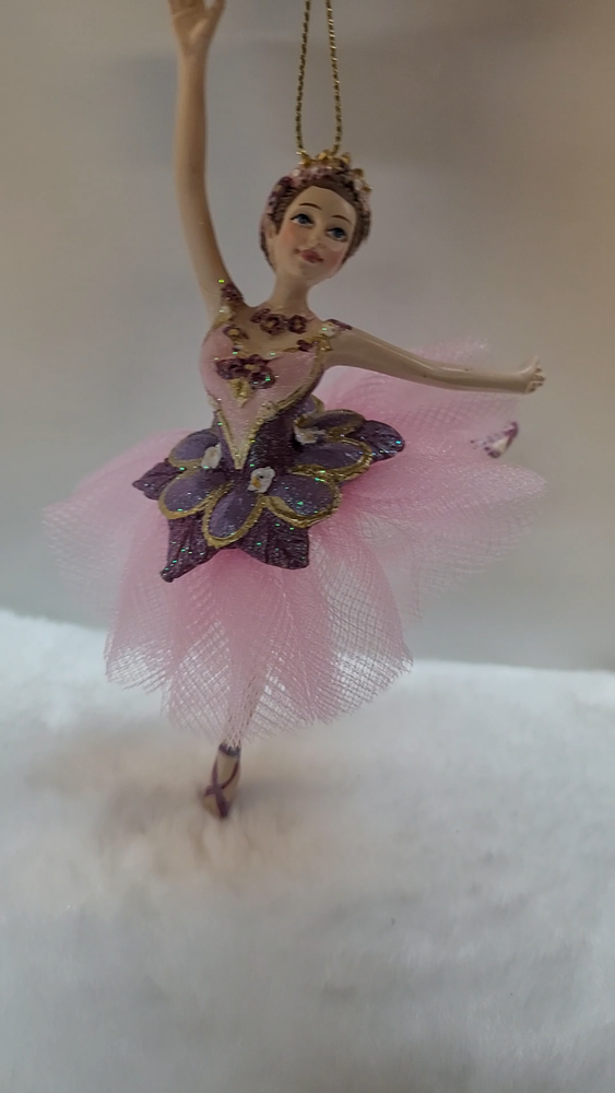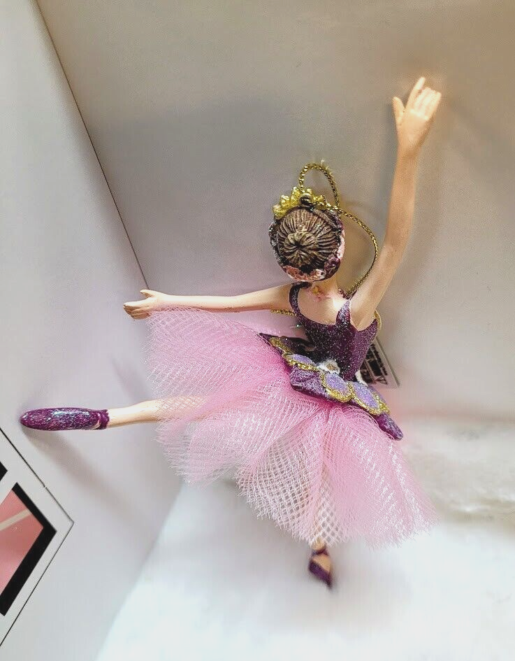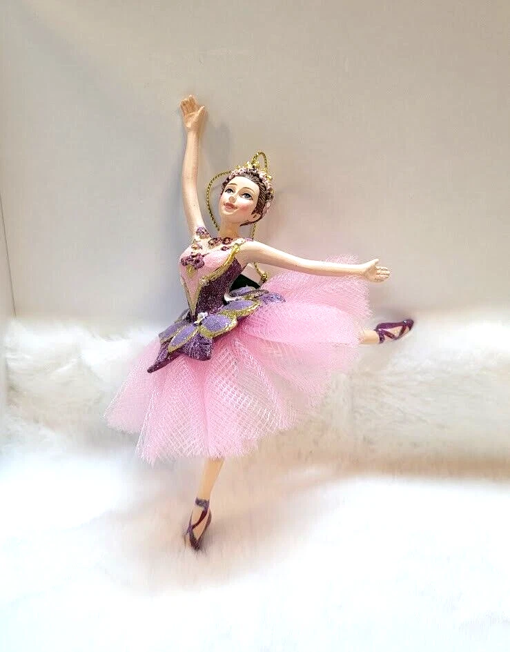 Add a touch of ballet charm to your holiday decor with the Kurt Adler Sugar Plum Ballerina Nutcracker Ornament. This artistically designed piece features a beautifully crafted 6-inch resin figurine of the iconic Sugar Plum Fairy, dressed in her enchanting pink tutu, complete with an overlay of burgundy resin glitter that gives her a floating appearance. This small yet delicate ornament is perfect for any Christmas tree and arrives with a pre-attached metallic gold fabric hanger for easy hanging. This gorgeous Sugar Plum Fairy is hand crafted by the renowned Kurt Adler company, known for their high-quality holiday decor. Celebrate the season with this exquisite ballerina ornament that brings the magic of the Nutcracker story to life. Approximate size: 6" T x 3" W x 3" D Because each item is individually handmade and due to variances in camera and computer monitor settings, appearance may vary slightly from photograph. Please note that this is a collector's item meant for display only and is not intended for children under age 14. From a non-smoking and pet free location. Thanks for shopping with us!