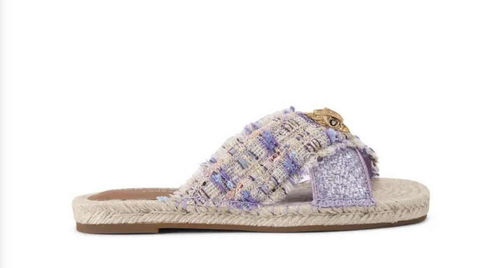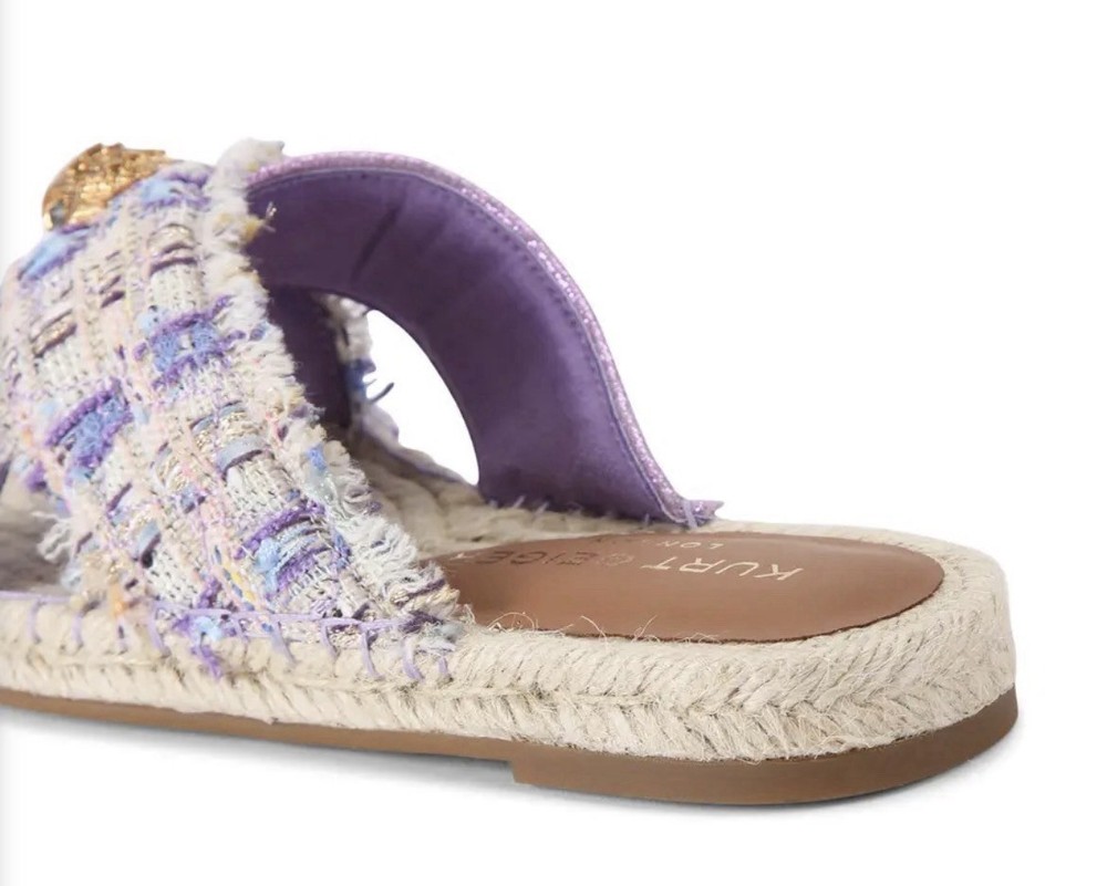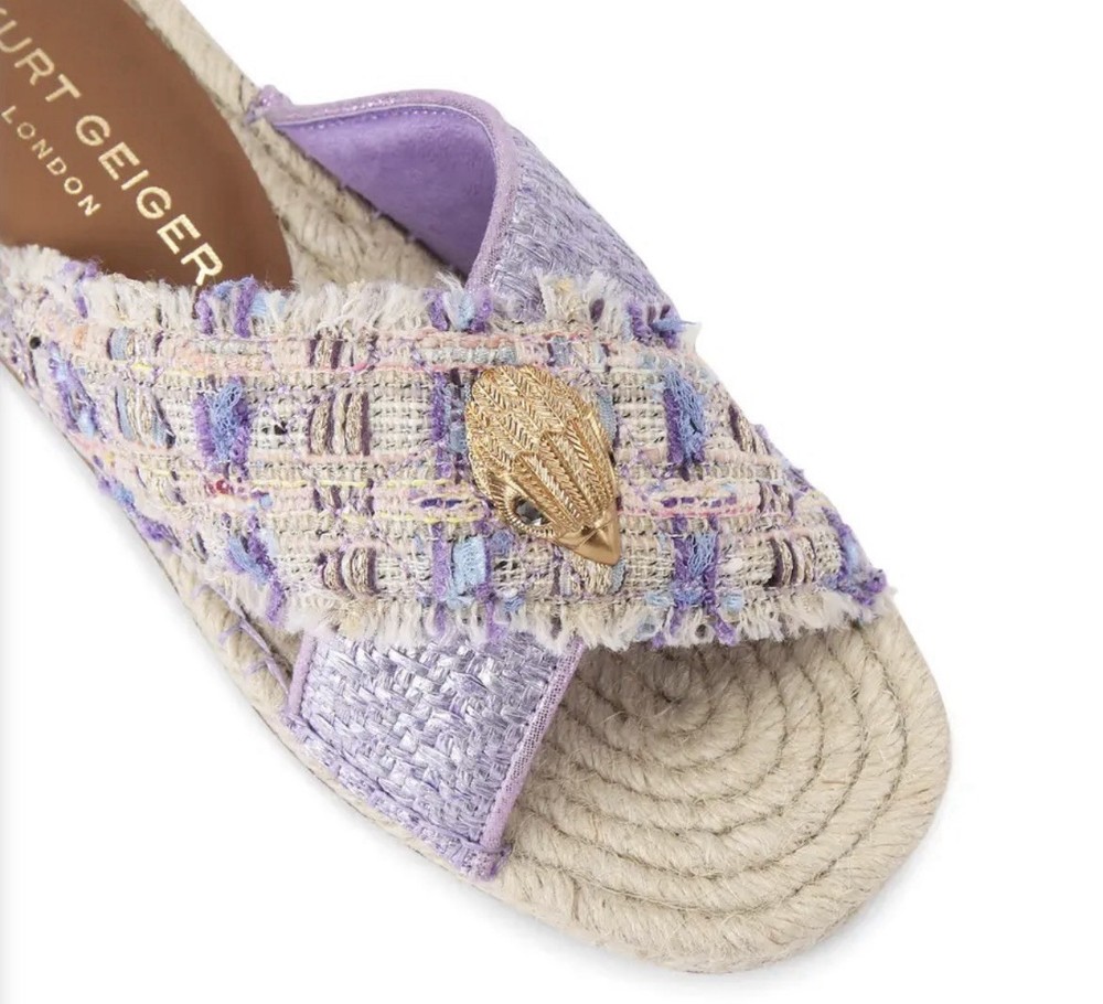 Brand new with tag, no box Size 40/9 This Kensington Espadrille sandal features a lilac upper with two crossed straps across the foot. One is in a metallic wedge and the other in a lilac tweed, topped with brushed gold eagle head.