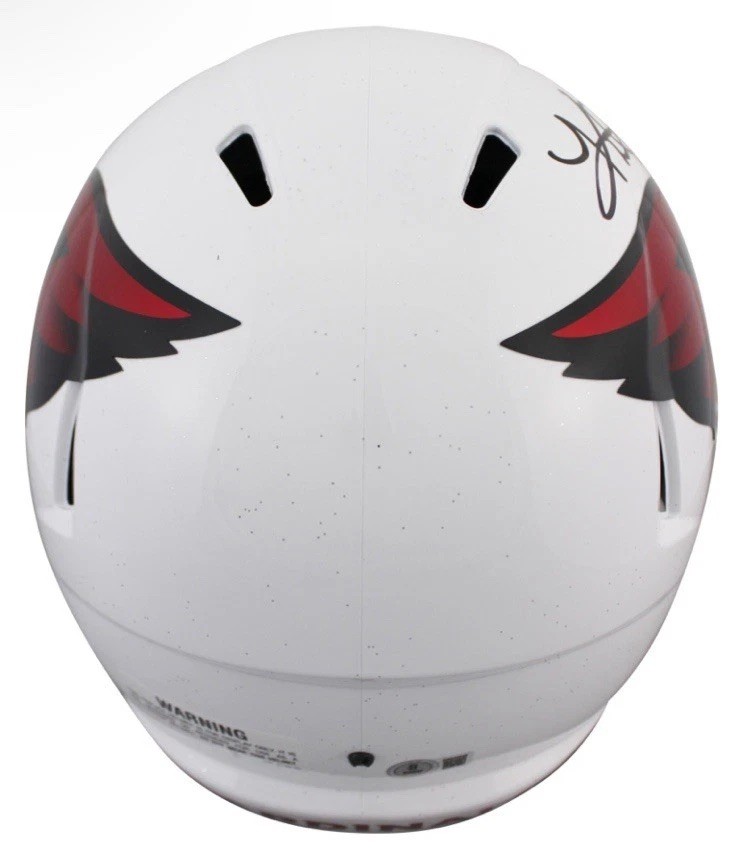 The product is a Kurt Warner signed Arizona Cardinals full-size speed helmet, authenticated by Beckett Authentication Services (BAS). This officially licensed NFL helmet features the signature of the legendary football player, making it a valuable collectible for fans of the sport and the Cardinals franchise. The autograph certification adds to the authenticity and appeal of this unique memorabilia item, which was manufactured in the United States.