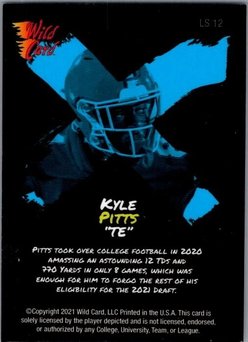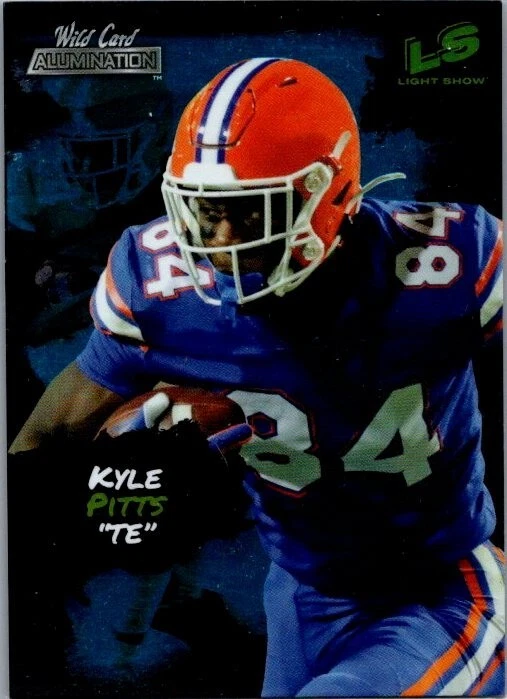 Capture a piece of sports history with the Kyle Pitts 2021 Wild Card Alumination Light Show #LS12 rookie card. As a standout addition to any collection, this card features the talented tight end in his Florida Gators gear, later joined by the Atlanta Falcons. With a stunning blue parallel variety, the card is a visually striking piece that showcases Pitts' potential as an NFL star. The card is part of the highly sought-after 2021 Wild Card set and is designed with a 'Light Show' theme that sets it apart from other cards in the series. Numbered GG-12, it is a unique find for fans of football and trading card enthusiasts alike. It's crafted from quality card stock and is presented in English, making it an accessible and valuable collectible for a wide audience.