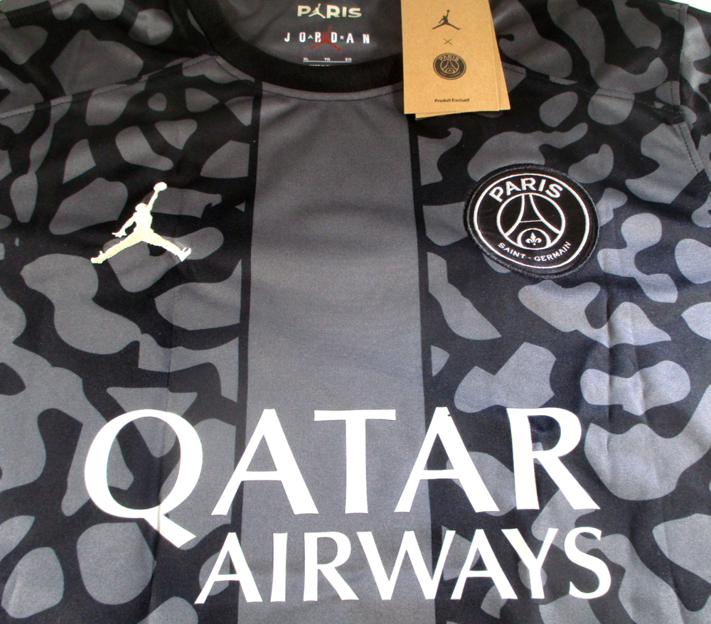 This sale is for a new condition Paris Saint-Germain Jordan Brand Dri-Fit pro-style soccer jersey in size extra-large, featuring the Jordan, Paris Saint-Germain as well as size and sponsorship tags and/or logos affixed or heat pressed to the uniform. This is a grey and black jersey with white and orange characters and stripes. The jersey has been hand signed by and Team France and former Paris Saint-Germain Superstar Forward Kylian Mbappe in black sharpie across the number on the back of this item. This item has been authenticated by Global Authentics as shown in the listing photos. Thank you for your interest in this item.