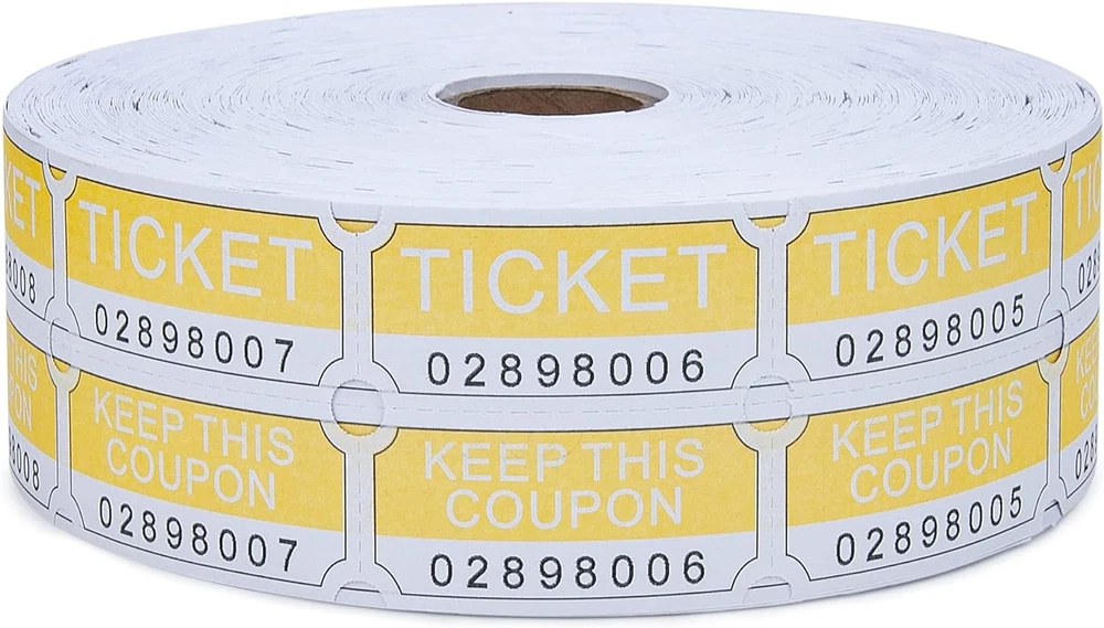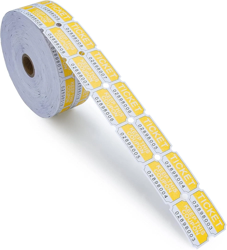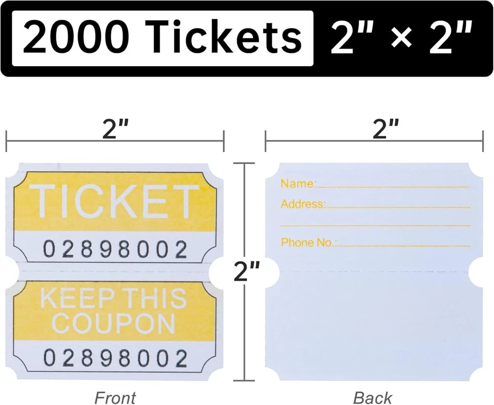 SIZE AND COUNT:2000 Pairs of 2” x 2” double tickets, each pair with a deposit ticket and keep ticket, and split into 2” x 1” halves-yellow CONSECUTIVE NUMBERS:consecutive numbers are printed in edge of raffle tickets,which avoid fake tickets sneak into these tickets and make counting more efficient. EASY TO TEAR:There are perforated lines between raffle tickes,so that it's very easy to tear apart.