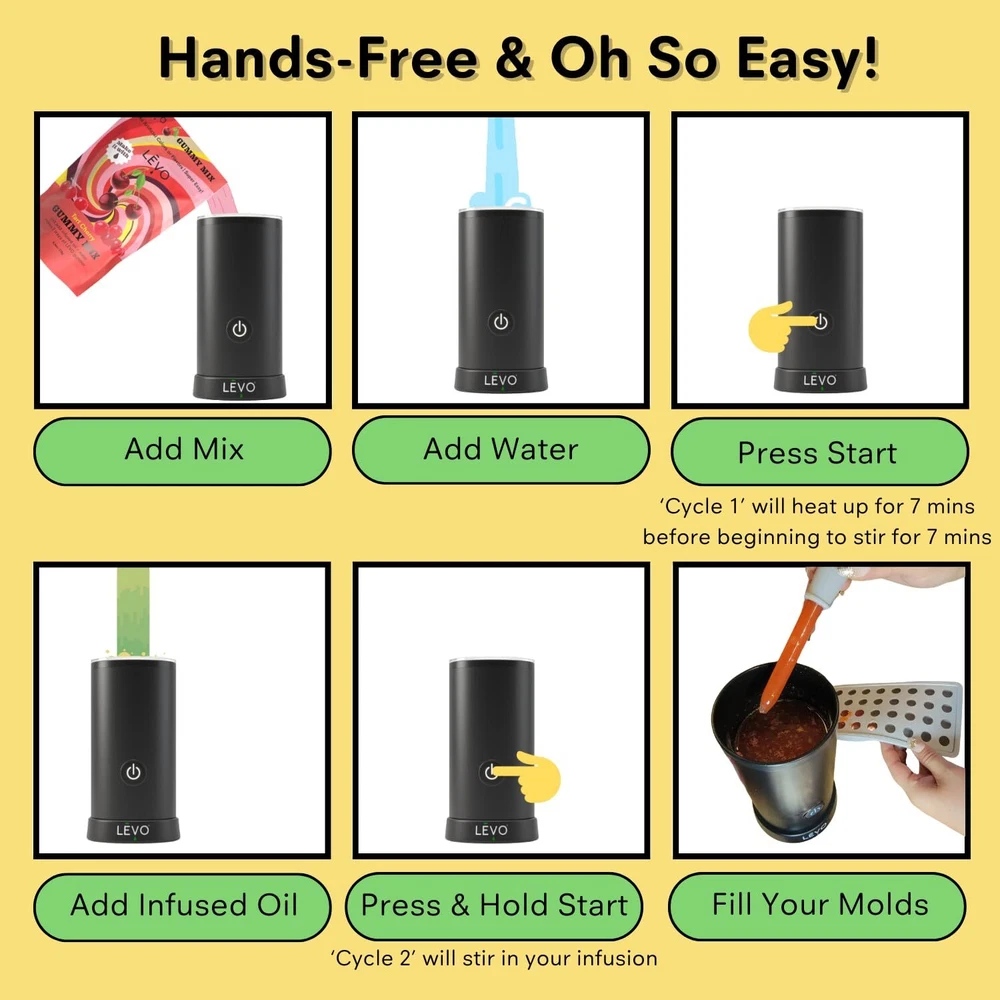 LĒVO Gummy Candy Mixer Say goodbye to gummy fails! The LĒVO Gummy Candy Edibles Mixer makes delicious homemade gummies in just a few simple steps so you can get perfectly potent gummies at home every time! The LĒVO Gummy Candy Mixer makes DIY gummy making as easy as making coffee! No more standing over a hot stove, handheld mixers or burnt gummy mix! The LĒVO Gummy Candy Mixer does all the hard work for you. Constant stirring, precise temperature and time controls, and a non-stick, easy to clean surface means you get the perfect homemade gummy candy every time! Made to work perfectly with any LĒVO Gummy Candy Mix and your infused LĒVO II or LĒVO C oil or butter so you can control the dosage and potency of your edibles at home! Once your gummy mix is done, use your LĒVO droppers to transfer your gummy mixture to the LĒVO silicone Gummy Molds without making a mess or wasting a drop of your delicious infusions! Eliminate the stress and the mess of DIY gummies with the LĒVO Gummy Candy Mixer! Join the infusion revolution. Make sure to look for all of our herbal infusion products available on Amazon. The LĒVO Gummy Candy Mixer is the foolproof solution to making gummies with precise temperature and time and without a saucepan and whisk! This machine takes the hard work out of stirring so no more standing over a hot stove or burnt gummy mix. You can even make it on the go anywhere where there's an outlet! It’s easy to clean and ensures the perfect gummy candy every time, making up to 1 package of LĒVO Gummy Mix per batch. MAKE YOUR OWN INFUSED GUMMIES: Take the fuss out of making DIY gummies and say goodbye standing over a hot stove with burnt gummy mix! With the LĒVO Gummy Candy Mixer, you can use your custom homemade infused MCT or Coconut Oil to craft gummies at home and experiment to find your desired potency! PERFECT DIY GUMMIES EVERY TIME: The LĒVO gummy mixer takes all the hard work out of whisking, stirring and keeping an eye on your gummy candy mix on the stove! Set it and forget it! It’s the foolproof solution to making gummies with precise temperature and time settings so you can get perfect infused gummies at home every time. The mixer has customized firmware that mimics the same process you would follow on the stove- but automatically and hands-free! EASY TO USE: Add your favorite LĒVO Gummy Mix Flavor to the Gummy Candy Mixer, mix in 6 tablespoons of water, then press start. The cycle will heat up for 7 minutes BEFORE beginning to stir, then it will automatically stir for 7 minutes after it has been heated. Then mix in 4 tablespoons of infused oil, hold the button for 3 seconds to begin the second cycle to stir in the infused oil into your candy mix. When the cycle is complete, dispense your mix into candy molds and you’ll have DIY edibles FIND YOUR DESIRED POTENCY: Take control of the potency of your gummies easier than ever before! Add 4 tablespoons of oil for stronger gummies, or 1 tablespoon for less potency so you can eat more gummies at a time! The LĒVO Gummy Candy Mixer features precise temperature and time control so all the guesswork is removed. Whether you’re wanting an extra potent treat or maybe just a bit less, the LĒVO Gummy Candy Mixer makes the perfect edible every time.