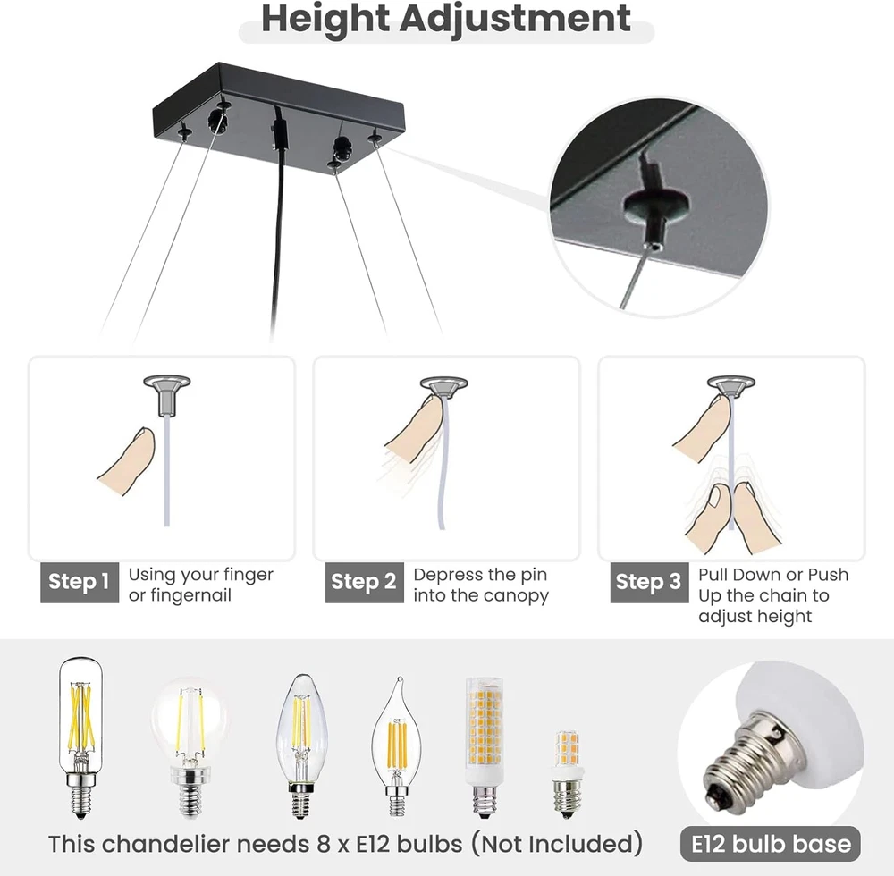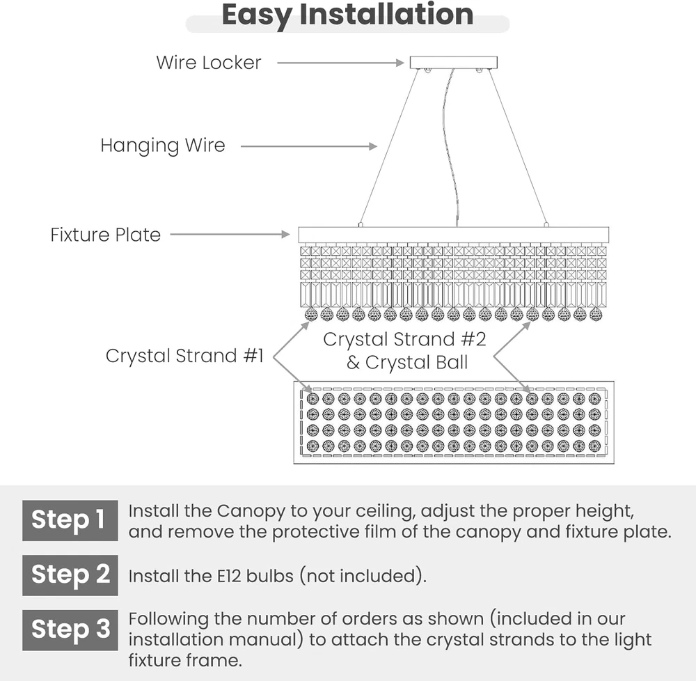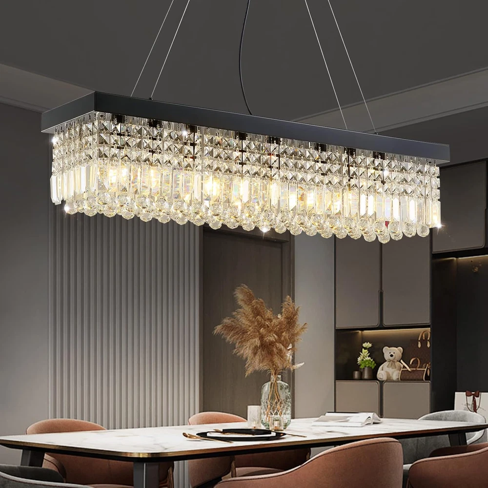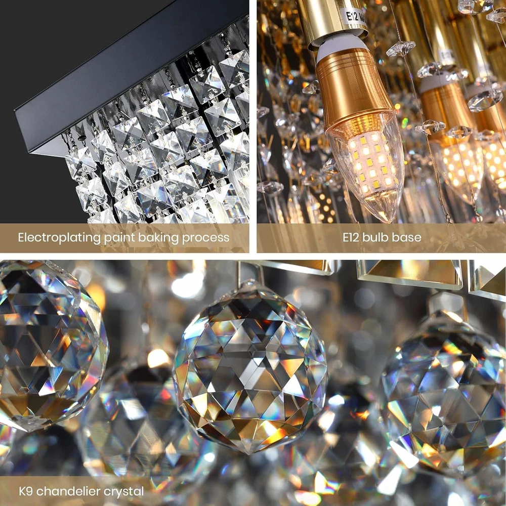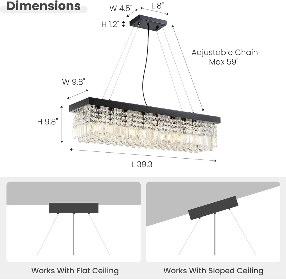 Store New Arrivals Add to Favorite View Feedback Contact Rectangle K9 Crystal Chandelier Modern Rectangular Pendant Lighting Fixture for Dining Room Kitchen Island Bedroom Black L40 X W10 X H10 Description Item model number CL010842 Light Source Type LED, Incandescent, Halogen Style Modern Power Source AC Number of Light Sources 8 Country of Origin China Embellishment Crystal Theme Crystal & Modern Design Batteries Included? No Lighting Method Downlight Controller Type Push Button Unit Count 1 Count Room Type Stairway, Entryway, Lobby, Hallway Assembly Required Yes Switch Type Touch Product Dimensions 40"L x 10"W x 10"H Material Stainless Steel Installation Type Flush Mount Model Name Rectangle K9 Crystal Chandelier Is Discontinued By Manufacturer No Specific Uses For Product Dining Room, Living Room, Kitchen Island Fixture Type Non Removable Brightness 5120 lumen Control Method Touch Light Color [VARIES] Batteries Required? No Item Weight 25.8 pounds Light fixture form Ceiling Special Features Adjustable Height, Luster Black Light Fixture Body, Easy Installation, Top K9 Chandelier Crystals Special Feature Adjustable Height, Luster Black Light Fixture Body, Easy Installation, Top K9 Chandelier Crystals Part Number CL010842P Shade Color Black, Clear Mounting Type Flush Mount Color Black(Hanging) Finish Type Polished Wattage 200 Watts Bulb Base E12 Shape Rectangular Voltage 120 Volts Plug Format A- US style Shade Material Top K9 Chandelier Crystal, Stainless Steel Finish types Polished Included Components Installation Manual, Spare Crystals, Crystal Chandeliers, Mounting Hardware Size L40" 🖊️[ RECTANGLE CRYSTAL CHANDELIER ]: This crystal chandelier for dining room is using top K9 chandelier crystals and each crystal is handpicked to ensure the surface is clean and sparking when the lights are on. The rectangular light fixture is using metal materials and professional electroplating and spray processes to provide a smooth and luster black surface. 🔧EASY CHANDELIER INSTALLATION: 3 Easy Steps: 1. Remove the protective film, adjust the proper height, and install the canopy to your ceiling; 2. Install the E12 bulbs (bulbs not included); 3. Hang the Crystal Strands to the chrome light fixture following the order shown in the manual. We have upgraded our rectangle chandelier packaging and installation processes. Crystals and the light fixture are securely packaged to prevent unexpected damage during shipping. 🏘️DIMENSION OF CRYSTAL CHANDELIER: Length 40" x Width 10" x Height 10". The hanging light chain is adjustable, and the length is 59"(150cm) max, and you can easily adjust the height by using the small locker pins on the canopy. This modern crystal chandelier is an art decoration for your dining room, kitchen island, and living room. 💡8-LIGHT DINING ROOM CHANDELIER: This modern crystal chandelier required E12 Bulb base x 8, max 40W (bulbs not included). Fully dimmable when used with dimmable bulbs and a compatible dimmer switch(plug and switch are not included). Enjoy the smooth comfortable lighting provided by our rectangular chandelier. 💘RELIABLE CUSTOMER SERVICE: 7 PM has provided high-quality crystal chandeliers, pendant lights, and fandeliers for household and commercial users for years. We provide free and after-sales consulting services. You can buy it in confidence, we provide 30 days of free return and a 365 day quality . Product Description The video showcases the product in use. The video guides you through product setup. The video compares multiple products. The video shows the product being unpacked. 7PM Crystal Chandeliers Show Time !! Rectangle Crystal Chandeliers Just For YOU-- Our chandelier is using silver light fixture body and top K9 chandelier crystals to explore the idea of ‘Modern and Luxury' Come & Enjoy a sweet meal with your family members with 7PM crystal chandelier for dining rooms ! EASY CHANDELIERS INSTALLATION VIDEO Rectangular Chandelier Crystal 4 Easy Steps Step 1 : Remove the protective film, adjust the proper height, and install the canopy to your ceiling; Step 2 : Install the E12 bulbs (bulbs not included); Step 3 : Hang the Crystal Strands to the black light fixture following the order shown in the manual. The video showcases the product in use. The video guides you through product setup. The video compares multiple products. The video shows the product being unpacked. Product Specification 40 Inches Crystal Chandeliers Style: Modern, Luxury. Material: Crystals, Stainless Steel. Color:Black. Design: Rectangle Crystal Chandelier. No. of Bulbs: 8 x E12 Bulbs (not included). 1 SCENES DISPLAY 2 DINING ROOM DECOR 3 LIVING ROOM DECOR MORE CATEGORY ABOUT 7PM Materials Raindrop Crystal Balls, Stainless Steel Materials Raindrop Crystal Balls, Stainless Steel, Wooden Blades Materials Raindrop Crystal Balls, Stainless Steel Dimensions L 10" x W 10" x H 15" Dimensions D 52 '' x H 22'' Dimensions D 32" x H 94" Applications Hallways, living room, foyer, closet, kitchen island. Applications Living room, bedroom, dining room. Applications Spiral staircase, foyer, entryway, living room, high ceilings. 7PM Crystal Chandeliers Comparisons K9 Crystals Materials K9 Crystals L40 x W10 x H10 Dimension L47 x W16 x H24 Black Color Chrome, Silver K9 Crystals Materials Aluminum L40 x W10 x H10 Dimension D: 15.7 + 23.6 Black Color Gold K9 Crystals Materials K9 Crystals L40 x W10 x H10 Dimension L40 x W10 x H40 Black Color Chrome, Silver K9 Crystals Materials K9 Crystals L40 x W10 x H10 Dimension L25 x W10 x H32 Black Color Chrome, Silver 7PM Raindrop Chandeliers 7PM Ring Chandeliers Gold 7PM Raindrop Chandeliers 7PM Rectangle Chandeliers ABOUT US We offer the best prices around on high quality products. Our E-store includes media such as books, movies, music and games while offering electronics, toys, sporting apparel, clothing, tools, general home, garden items and more. SHIPPING We are always working hard to ensure your package arrives as soon as possible. Plea