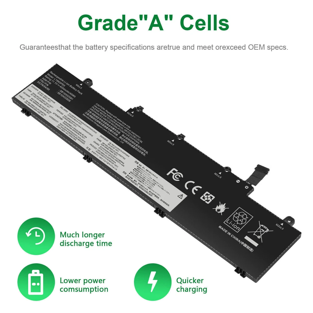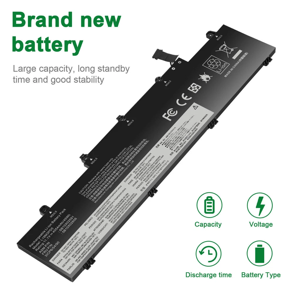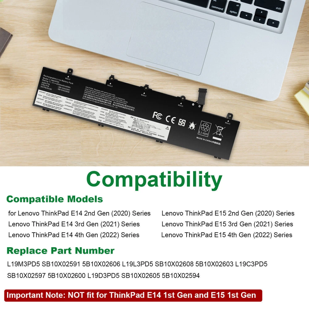 L19C3PD5 L19D3PD5 L19M3PD5 Battery For Lenovo ThinkPad E14 E15 2nd Gen 2020 FAST About us: ➡️We are a laptop battery manufacturer with more than many years , we are positioned for high quality, simplicity and durability. Our products are stable, safe and reliable in performance,and all batteries are made of Grade ''A'' cells . ➡️ If you have any question, pls feel free to contact us first instead of opening any form of case. Contacting our customer service is the best way to better cooperate with each other,thanks a lot. ➡️ Before purchasing, pls confirm that your model/capacity/size is compatible with your laptop . If you don’t know your model, you can provide us a picture of the appearance of the old battery for us to confirm. ➡️ Your positive feedback are the driving force for us to move forward. Specifications: Condition: Brand New , 'A' grade cells,100% Compatible! Battery type: Li-ion Battery Voltage: 11.1V Capacity: 45Wh Number of Battery Cells: 3 Life Cycles (times): 300-500 Certification: CE FCC RoHS Color: black as pictures Operation time: approx 1.5-3.5 hours Package including: 1×battery (in packing box) Compatible Part Numbers: L19M3PD5 L19C3PD5 5B10X02600 SB10X02597 L19D3PD5 5B10X02594 SB10X02605 5B10X02606 SB10X02591 L19L3PD5 5B10X02603 SB10X02608 L20C3PD4 5B11C73245 SB11C73240 L20D3PD4 5B11C73242 SB11C73241 L20M3PD4 5B11C73244 SB11C73243 L20L3PD4 5B11E24665 SB11E24664 3ICP6/54/90 NOTE: Not fit for Lenovo ThinkPad E14 1st Gen 2019 Series; Not fit for Lenovo ThinkPad E15 1st Gen 2019 Series. Compatible Model: Replacement for Lenovo ThinkPad E14 Gen 2 2020(Type 20T6, 20T7, 20TA, 20TB) series: ThinkPad E14 2nd Gen(20T6), ThinkPad E14 2nd Gen(20T6000MGE), ThinkPad E14 2nd Gen(20T6000RGE), ThinkPad E14 Gen 2 20T6CTO1WW, ThinkPad E14 Gen 2 20T6S0GB00, ThinkPad E14 Gen 2 20T60008AU, ThinkPad E14 2nd Gen(20T7), ThinkPad E14 2nd Gen(20TA), ThinkPad E14 2nd Gen(20TA000CGE), ThinkPad E14 2nd Gen(20TA000DGE), ThinkPad E14 2nd Gen(20TA000EGE), ThinkPad E14 Gen 2 20TA002SAU, ThinkPad E14 Gen 2 20TA002WAU, ThinkPad E14 Gen 2 20TACTO1WW, ThinkPad E14 Gen 2 20TAS02R00, ThinkPad E14 Gen 2 20TAS04L00, ThinkPad E14 Gen2-20TA000DGE, ThinkPad E14 2nd Gen(20TB). Replacement for Lenovo ThinkPad E15 Gen 2 2020(Type 20T8, 20T9, 20TD, 20TE) series: ThinkPad E15 G2(20T8), ThinkPad E15 G2(20T8000MGE), ThinkPad E15 G2(20T8000TGE), ThinkPad E15 G2(20T8000VGE), ThinkPad E15 Gen 2 20T8CTO1WW, ThinkPad E15 Gen 2 20T8S0AA00, ThinkPad E15 Gen 2 20T80008AU, ThinkPad E15 G2(20T9), ThinkPad E15 Gen2-20T9S00K00, ThinkPad E15 G2(20TD), ThinkPad E15 Gen 2 20TDCTO1WW, ThinkPad E15 Gen 2 20TDS02H00, ThinkPad E15 Gen2-20TD002MGE, ThinkPad E15 G2(20TE). Replacement for Lenovo ThinkPad E14 Gen 3 2021(Type 20Y7, 20YD, 20YE, 20YF) series: ThinkPad E14 Gen 3(20Y7), E14 Gen 3(20YD), E14 Gen 3(20YE), E14 Gen 3(20YF). Replacement for Lenovo ThinkPad E15 Gen 3 2021(Type 20YG, 20YH, 20YJ, 20YK) series; Replacement for Lenovo ThinkPad E14 Gen 4 2022(Type 21EB, 21EC, 21E3, 21E4) series; Replacement for Lenovo ThinkPad E15 Gen 4 2022(Type 21E6, 21E7, 21ED, 21EE) series; How to install a new battery? 1. You need to turn off the laptop and disconnect the power at the same time. 2. Disconnect the old battery from the motherboard to avoid unnecessary damage caused by disassembling the battery. Then unscrew the old battery and save it. 3. Take out the old battery, install the new battery on the battery box, tighten the screws, and connect the wires of the new battery. How to maintain a laptop? 1. New battery: When using a new battery, it is best to discharge to 5% for several cycles. Then charge to 95%. So that it can be fully activated. 2. Excessive use: Do not deplete the battery to 0% often, which will cause damage to the battery or shorten the service life. 3. Charging sequence: when charging, first install the battery, then turn on the power, after fully charged, first cut off the power, and then unplug the power plug. 4. Long-term storage: Please fully charge and store unused batteries. (Charge once a month) Do not store in low battery to avoid reducing. What should be noted when using the battery? 1.If your computer will not be used for a long time, it is recommended that you remove the battery and store the battery separately. 2.It is recommended that you store the battery in a dry environment with a temperature range of -10--35 degrees Celsius, and avoid sunlight. 3.As the damaged lithium-ion battery will pollute the environment, it also has a certain degree of danger. Please do not disassemble or discard at will. Payment Delivery details Warranty & Return About us Contact us Payment 1. We accept payment via Paypay only. 2. All payments must be prepaid. Delivery details 1. Items are generally shipped out within 24-48 hours after your payment has been cleared (Sat. & Sun. excluded.) 2. Orders from the United States will all be shipped out via USPS and FedEx. The shipment usually takes 3-7 business days( Exclude public holiday), if you need the item urgently, please contact us for detail before purchase. 3. We ship to US ONLY and do not support Collection. 4. All items will be shipped to buyer's paypal address. Please check your paypal address before place the order. 5. We are not responsible for wrong or undeliverable address. We reserve the right to charge the shipping fee again for returned items due to wrong address. Warranty & Return 1. We provide 30 days money back on non-defective, undamaged, unused and resalable products. Product is not eligible for refund after the 30-day refund period has expired. 2. Our warranty does not extended to any products that are physically damaged or that are not under normal operating conditions as a result of misuse or improper installation on the buyer/user's part. 3. For all returned products, Please contact us for the returning address and Pls no return case. 4. In all cases, buyers pay shipping fees at their own cost to return products for exchange or refund. We will 