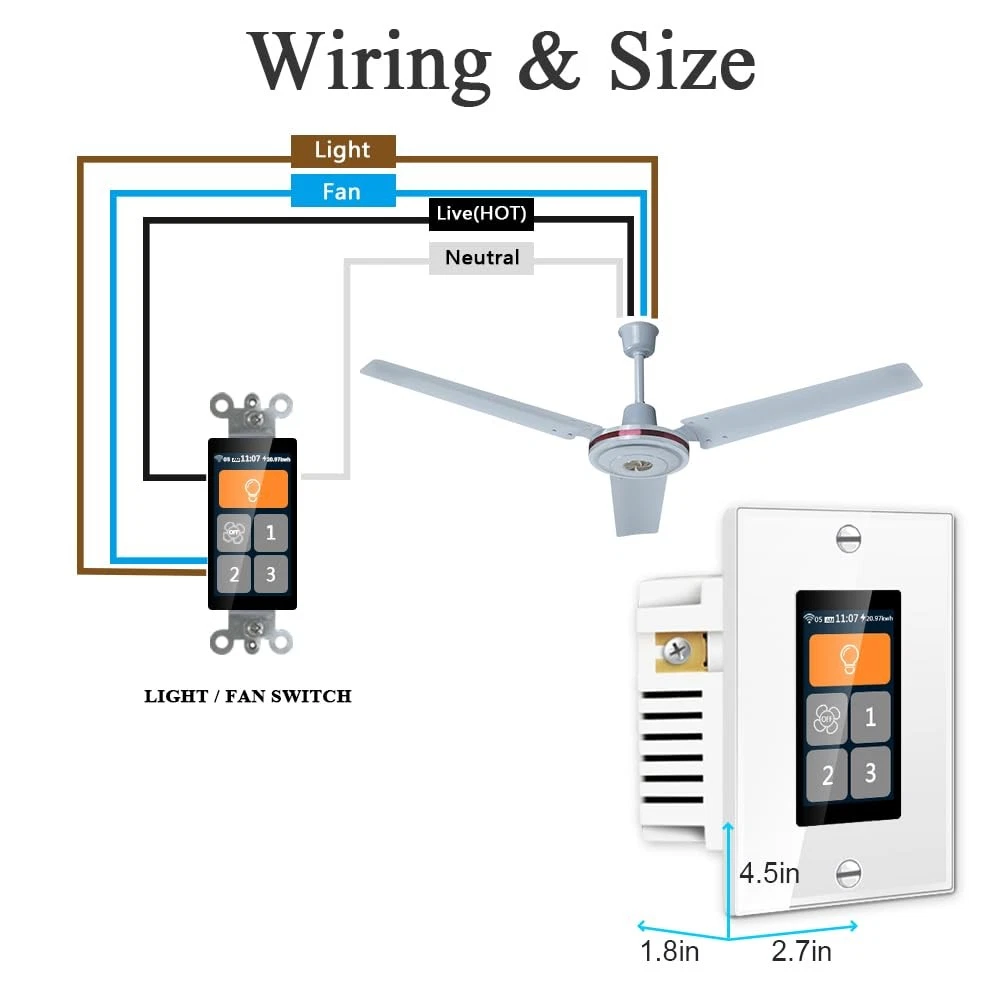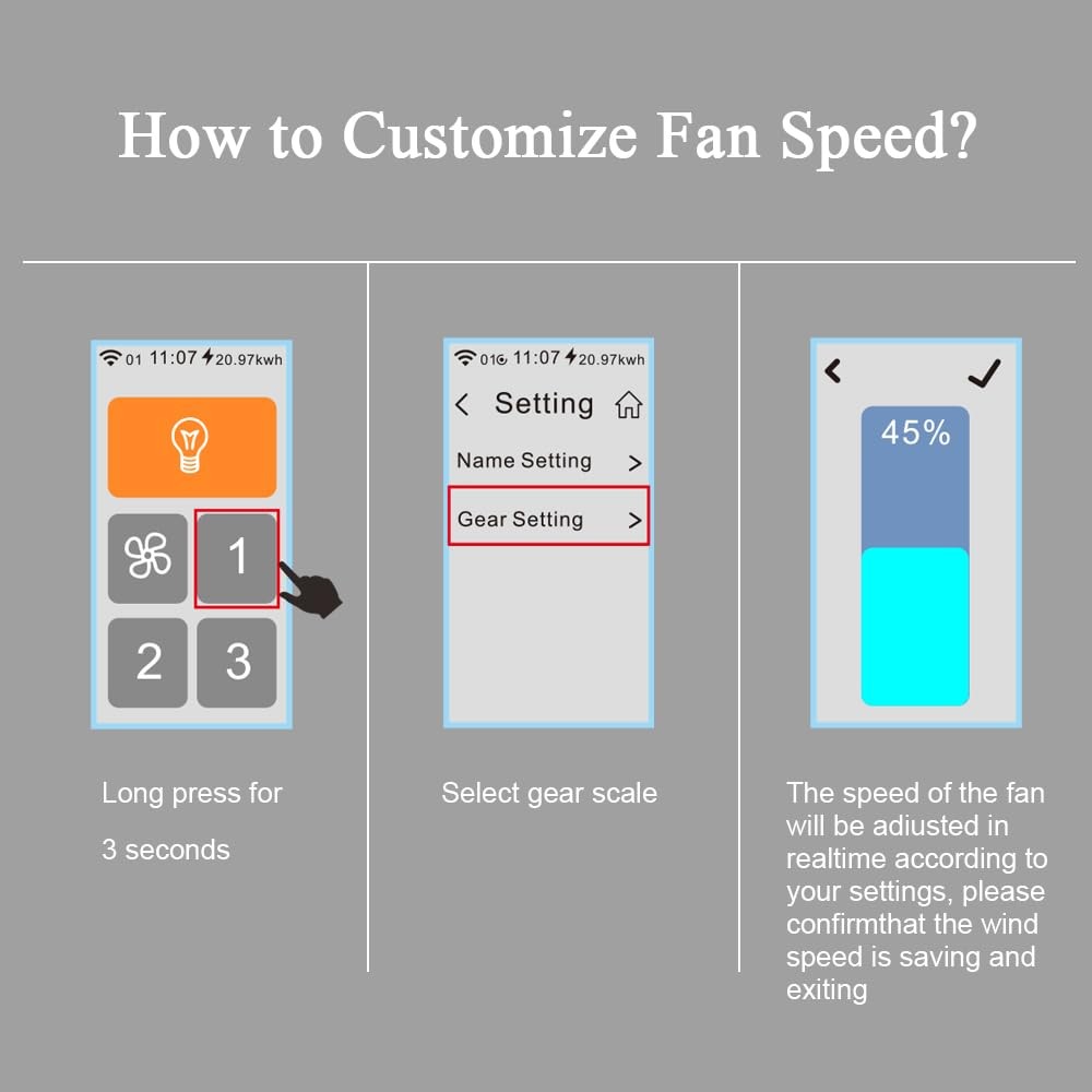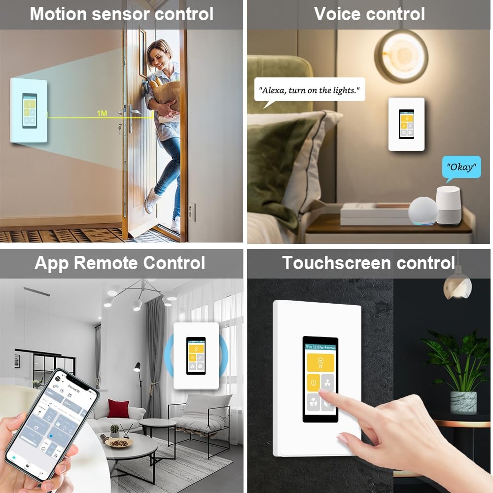 smart light switch đă3 Custom Fan Speed Buttonsă The fan speed wall switch with 3 custom speed buttons sets your exclusive speed and gets rid of the fixed speed zipper. đăWorks w/ All Bulb Typesăthe ceiling fan light switch work with 0-200W all bulb types such as 200W Incandescent/Halogen, 200W LED/CFL/MLV/ELV Bulb. đăEase of Installation & Ste-upăThe wifi fan light switch is standard size. It is the ease of installation & simple set-up. Also, it allows you to customize the light name, icon, button color, and background. Set them to cater to your preferences and your home style. đăSet Timers & SchedulesăSmart fan controller& ceiling light switch with timer repeats to support you in setting daily timer schedules or countdowns to automatically turn on and off while you're home or away. đ±ăControl from AnywhereăThe APP monitors the status of your smart switches and turns it on/off from anywhere, whether at home, in the office, or on vacation. đăVoice ControlăUse simple voice to control the light and fan. đăSmart ActionăA part of the 'Smart Livingâ series Smart Ecosystem, the smart switch works with other 'Smart Livingâ series devices so you can set smart actions and groupings with your other 'Smart Livingâ devices.