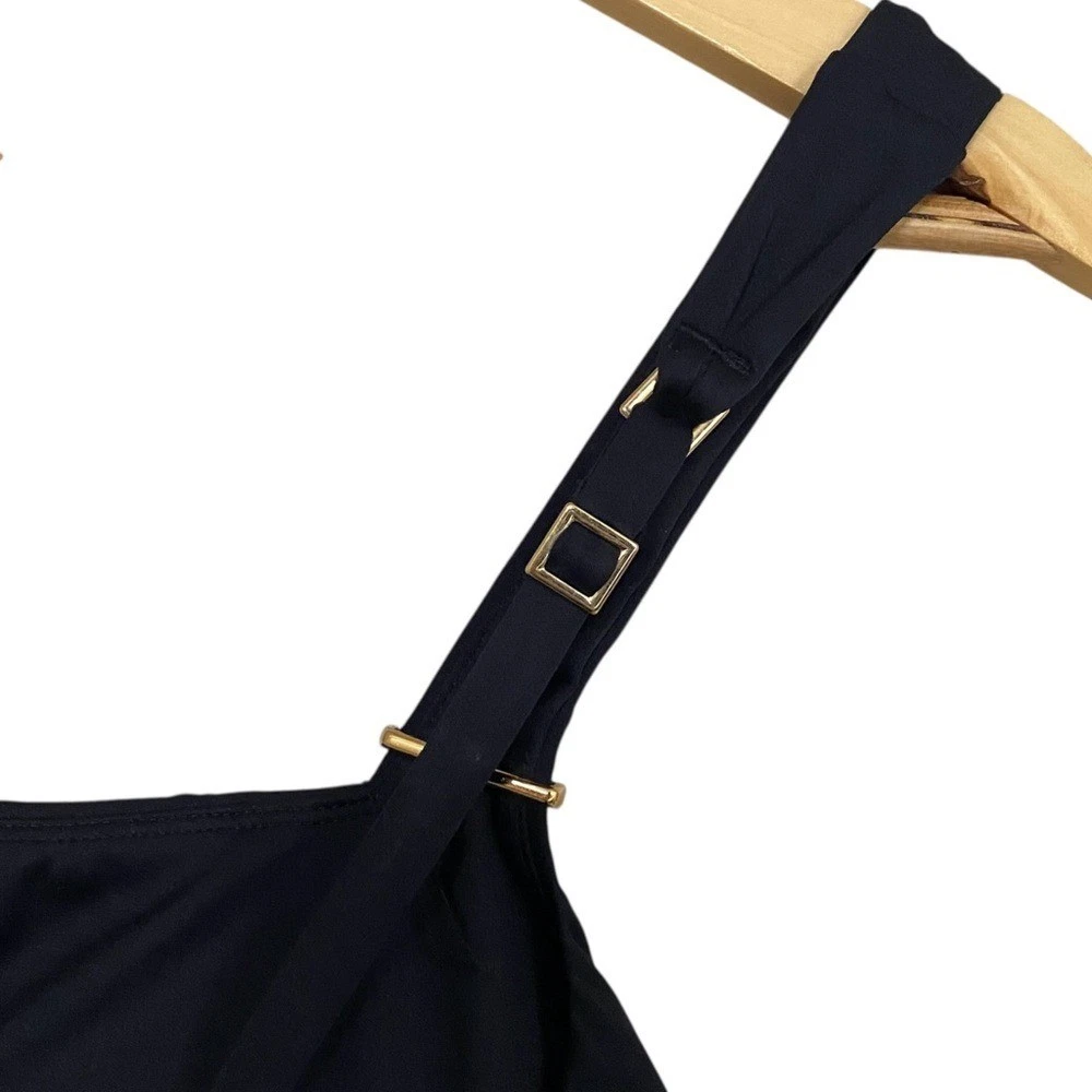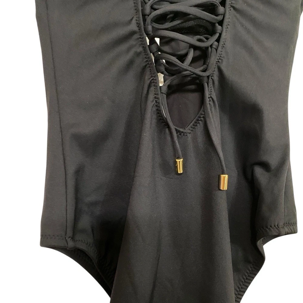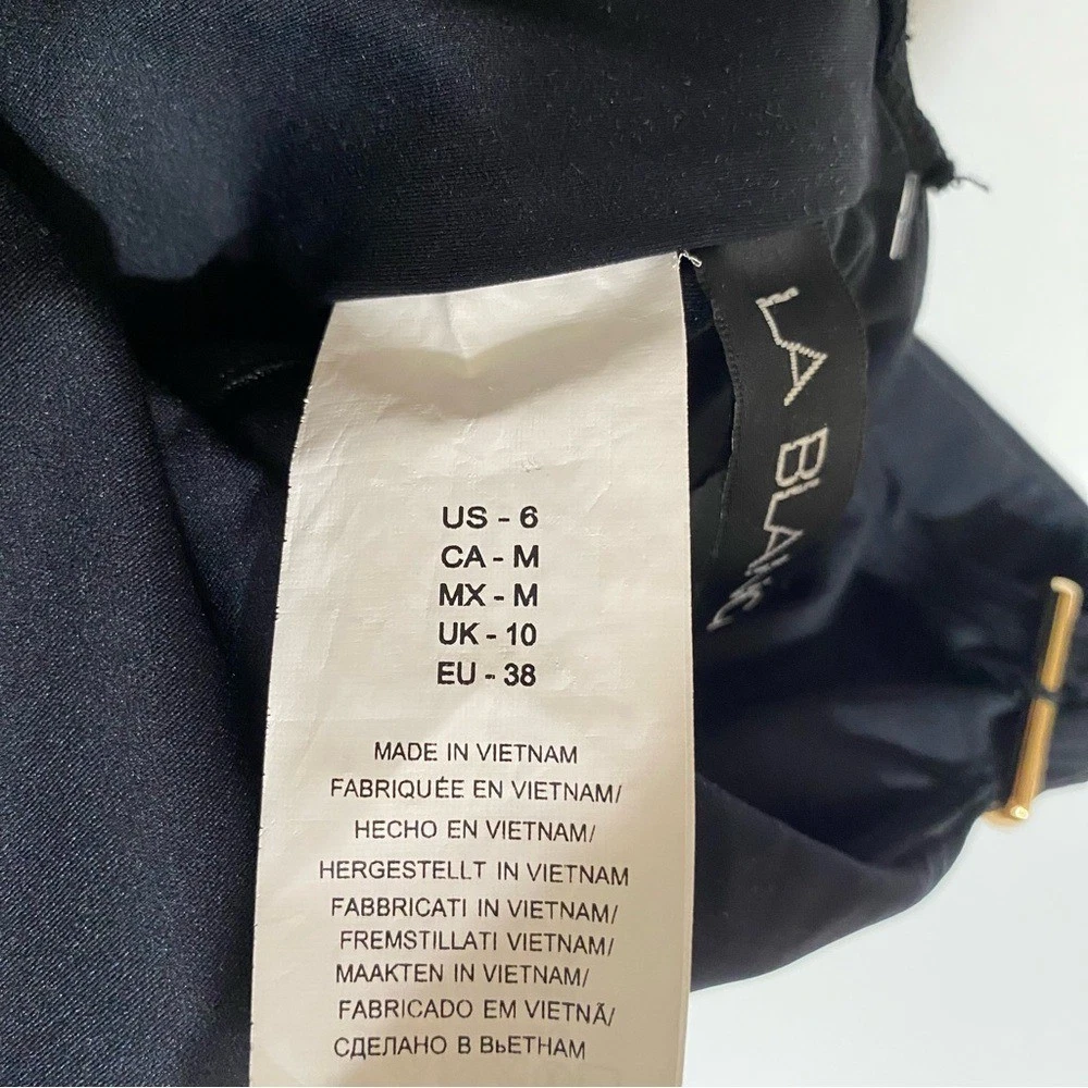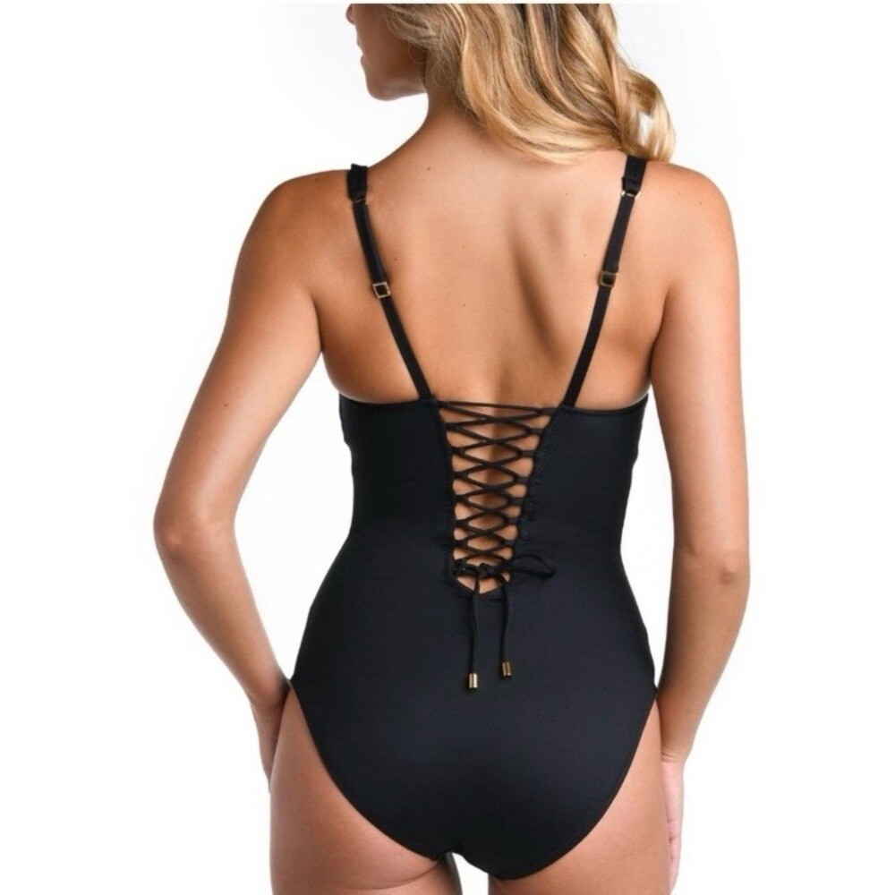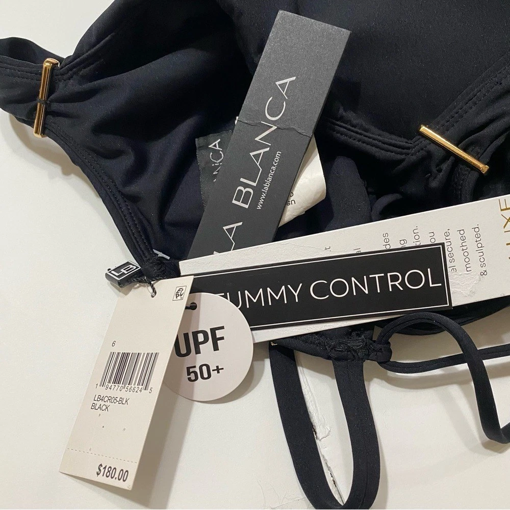 LA BLANCA Luxe Swimsuit Black One Piece Swim Tummy Control Compression NWT Size 6 Size chart in photos Introducing La Blanca Luxe line of compression swimwear. Designed with a specialty knit spacer fabric that consists of 3 dimensional layers, exclusive to La Blanca. Air filled space between the two surfaces provide cushioning and ventilation. Get ready to feel sculpted and confident while wearing this swimsuit! Details One piece swimsuit UPF 50+ High level of chlorine resistance Long lasting fit & shape retention Compression and shaping Adjustable straps w/ gold bar details Removable cups Lifting and sculpting Built-in tummy control Fast drying & moisture wicking Fabric Adjustable lace up back 57% Nylon, 43% Elastane